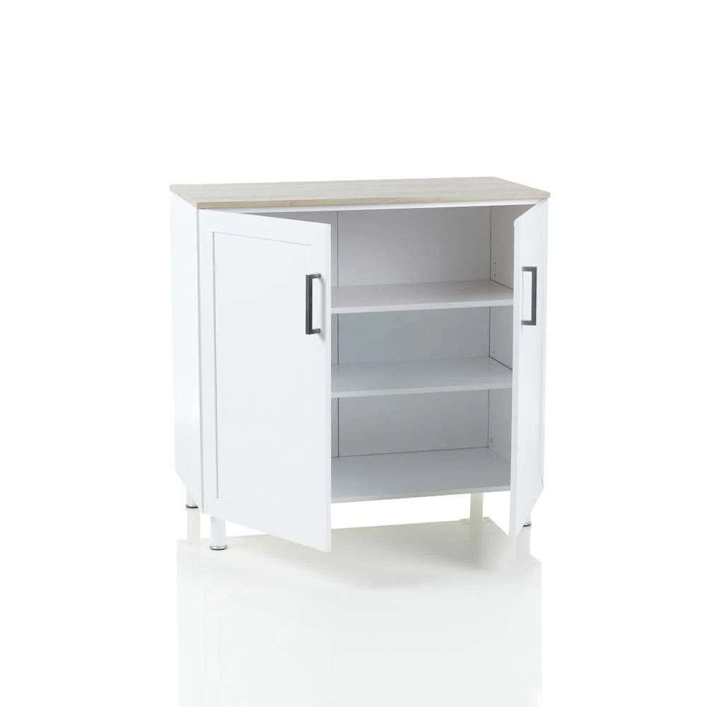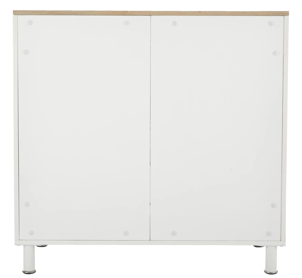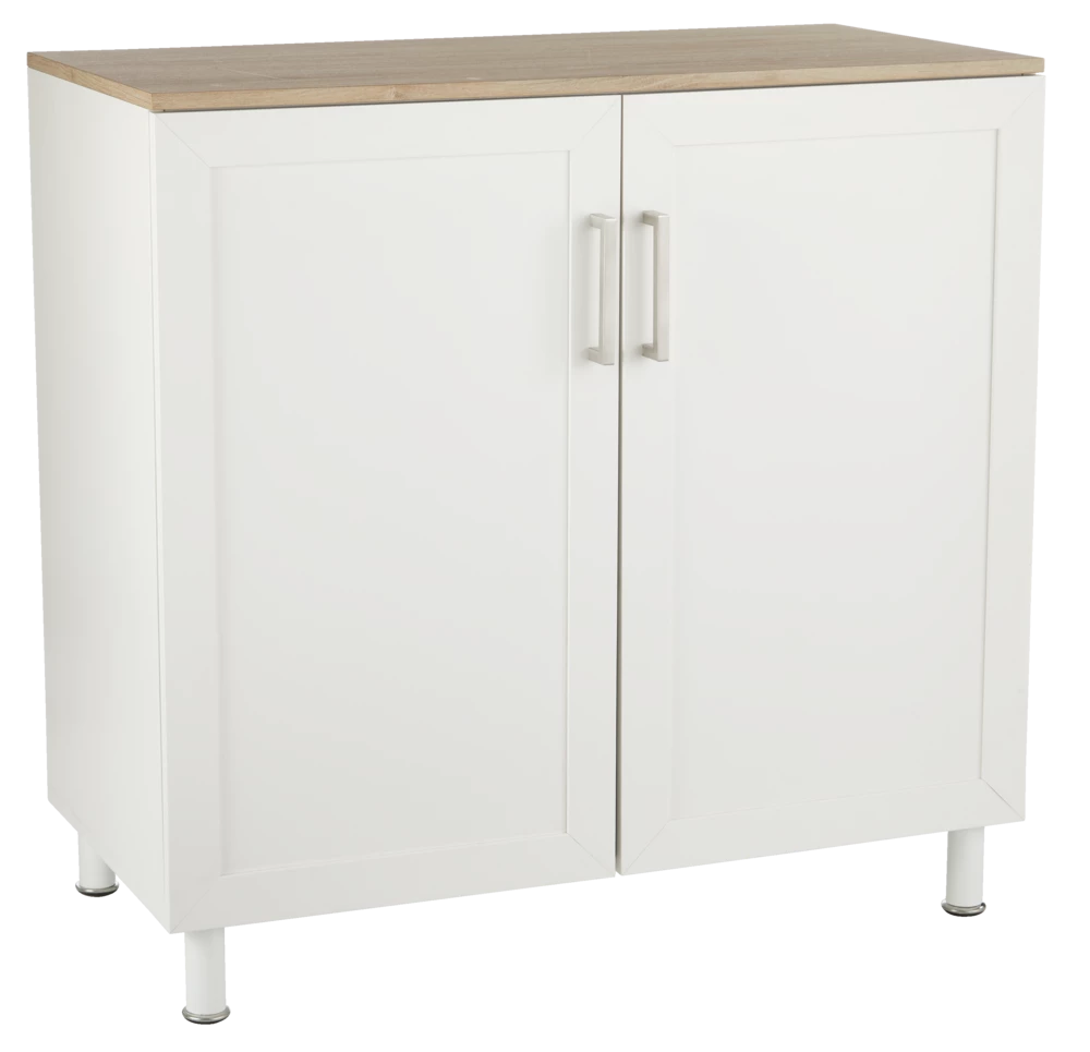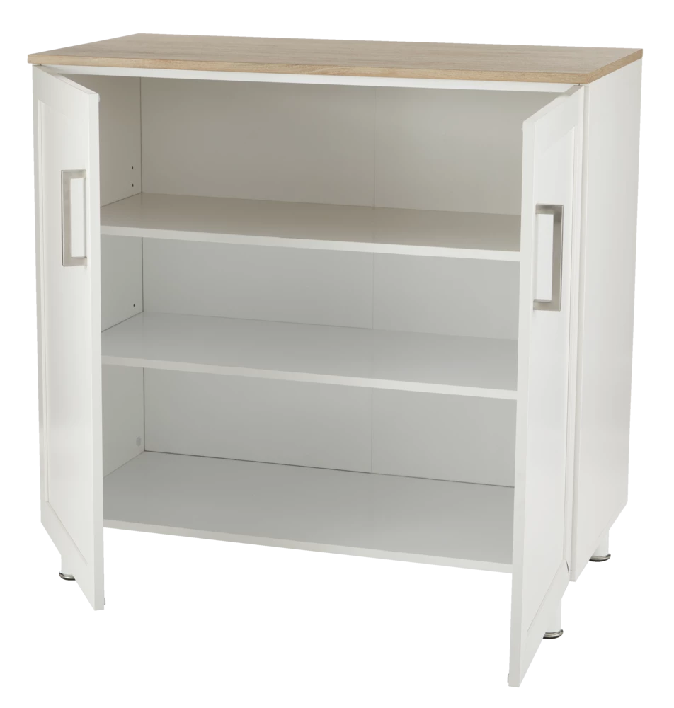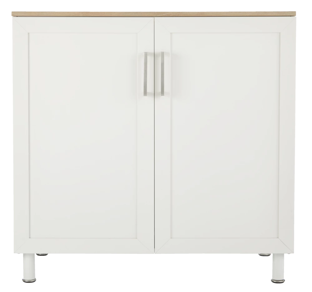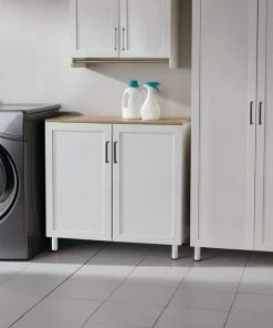 The For Living 2-Door Base Laundry Cabinet is a stylish and convenient way to add a little extra storage space in your laundry room, workshop, entryway, or wherever else you might need it. This storage shelf features two cabinet doors, which open to reveal two adjustable shelves inside. These adjustable shelves are handy for housing laundry detergent, dryer sheets, cleaning supplies and other household items. With a laminated natural oak finished top, brushed nickel handles, and a white base, this 2-door storage cabinet has a clean, sleek, and versatile aesthetic that easily complements any traditional or modern décor. For added convenience, this raised laundry room cabinet is equipped with exposed legs at the base to accommodate easy sweeping and vacuuming. The cabinet feet are adjustable, so you can level the cabinet to suit the space for reliable stability and a balanced work surface. This white laundry cabinet measures 36-inches wide by 18-inches deep and is 35-inches tall, providing ample storage space and a generous tabletop workspace. It’s a stylish and practical addition to virtually any room in your home. To clean this cabinet, simply wipe it down with a damp cloth as needed. To help prevent it from fading or turning yellow over time be sure to position your cabinet away from direct sunlight.