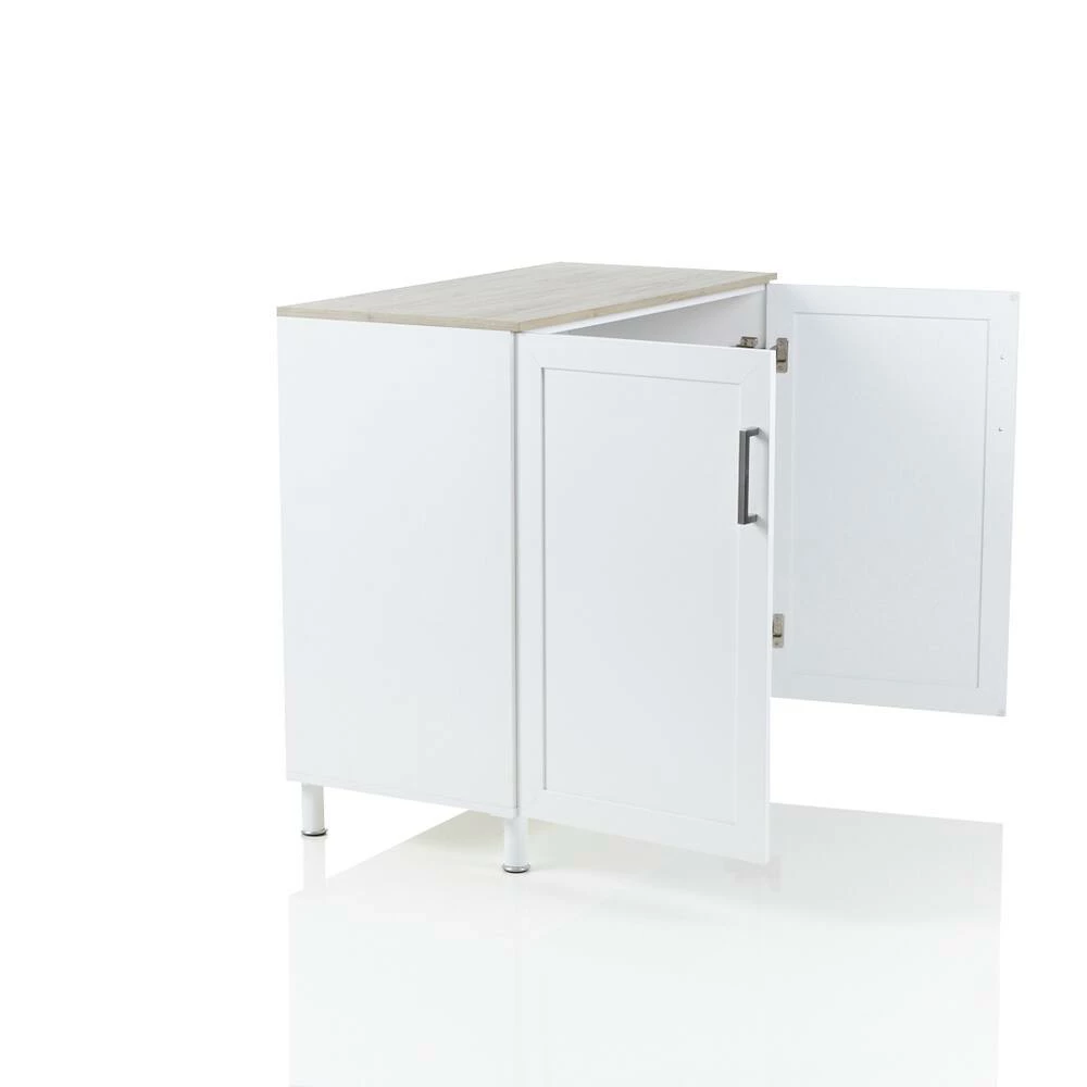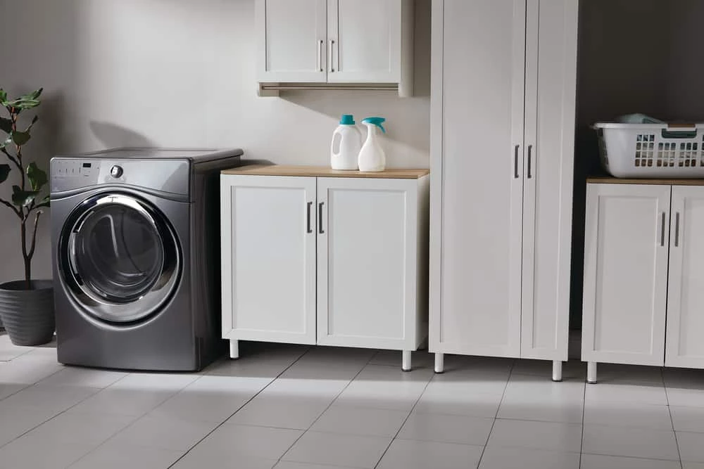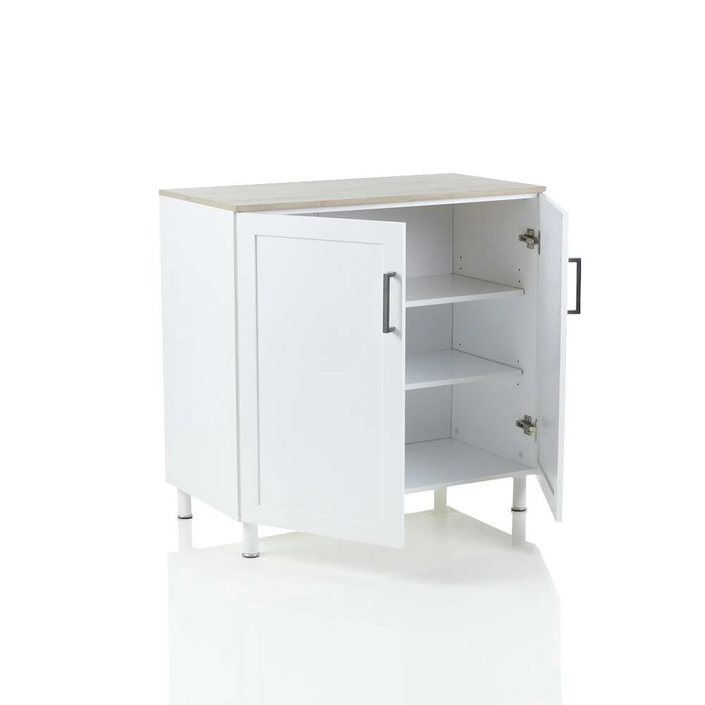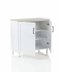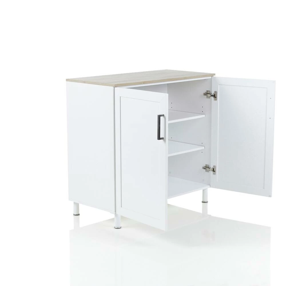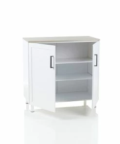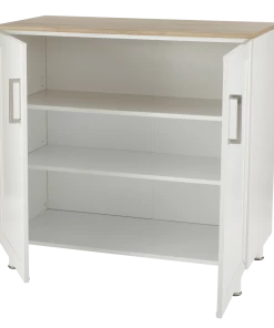 The For Living 2-Door Base Laundry Cabinet is a stylish and convenient way to add a little extra storage space in your laundry room, workshop, entryway, or wherever else you might need it. This storage shelf features two cabinet doors, which open to reveal two adjustable shelves inside. These adjustable shelves are handy for housing laundry detergent, dryer sheets, cleaning supplies and other household items. With a laminated natural oak finished top, brushed nickel handles, and a white base, this 2-door storage cabinet has a clean, sleek, and versatile aesthetic that easily complements any traditional or modern décor. For added convenience, this raised laundry room cabinet is equipped with exposed legs at the base to accommodate easy sweeping and vacuuming. The cabinet feet are adjustable, so you can level the cabinet to suit the space for reliable stability and a balanced work surface. This white laundry cabinet measures 36-inches wide by 18-inches deep and is 35-inches tall, providing ample storage space and a generous tabletop workspace. It’s a stylish and practical addition to virtually any room in your home. To clean this cabinet, simply wipe it down with a damp cloth as needed. To help prevent it from fading or turning yellow over time be sure to position your cabinet away from direct sunlight.