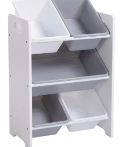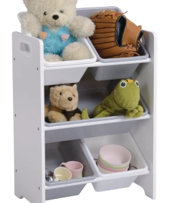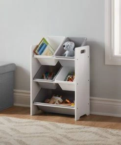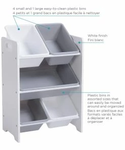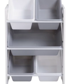 Featuring four small bins and one large bin, the For Living 5-Bin Storage Organizer has plenty of storage space for holding children’s toys and arts and crafts supplies in one tidy and accessible place. The plastic bins can be removed from the shelf and re-organized, so you can store your items in the most practical way. With its neutral white finish and white and grey bins, this storage bin organizer shelf is a versatile addition to any home.