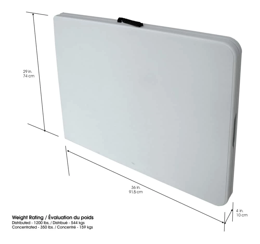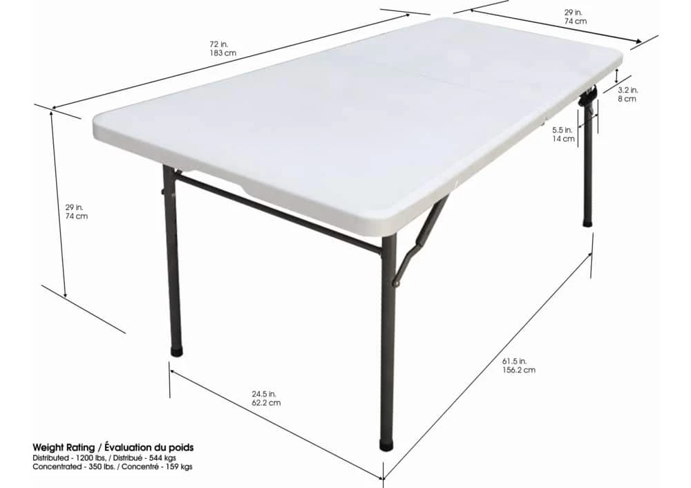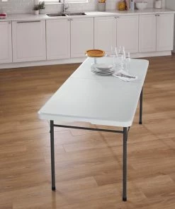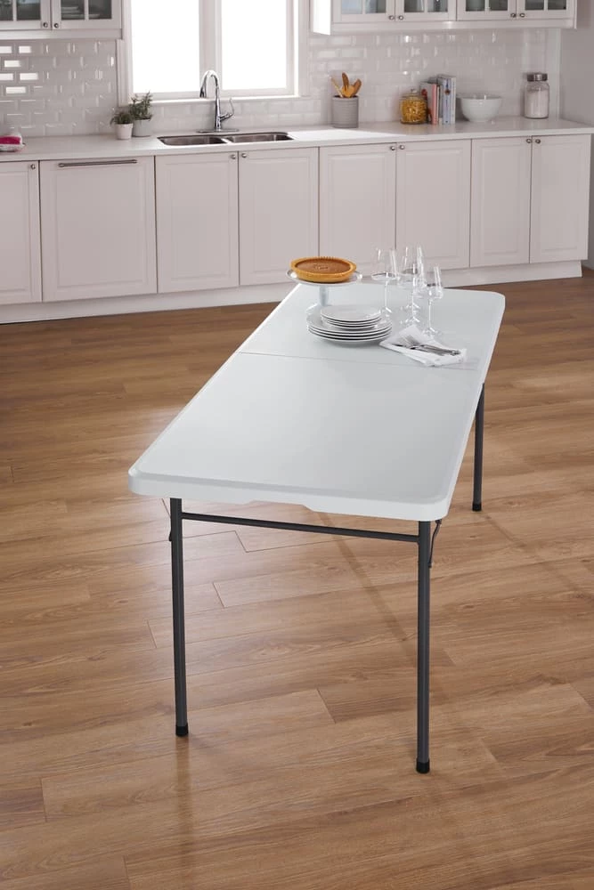 The For Living Heavy Duty Folding Table is a durable and convenient way to add extra work or table space to your home or office. Featuring a straight leg design for comfortable seating, this 6-foot foldable dining table allows you to add easily extra seating at holiday dinners, barbeques, birthday parties, and more. The heavy-duty construction is impact and stain resistant for seamless use both indoors and outside. With a commercial-grade frame and legs that can withstand up to 1200 pounds of evenly distributed weight, this heavy-duty plastic folding table is a hard-working addition to a garage or workshop. The secure lockable steel legs and frame ensure stability as you use this table for dining, garage sales, or for art and crafts with the kids. When it’s time to clean up, the sturdy surface is easy to maintain simply by wiping it down. When folded down, this white folding table is compact and easy to store. The built-in carry handle allows for comfortable transport as you move this table from location to location or pack it way in storage.