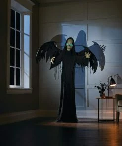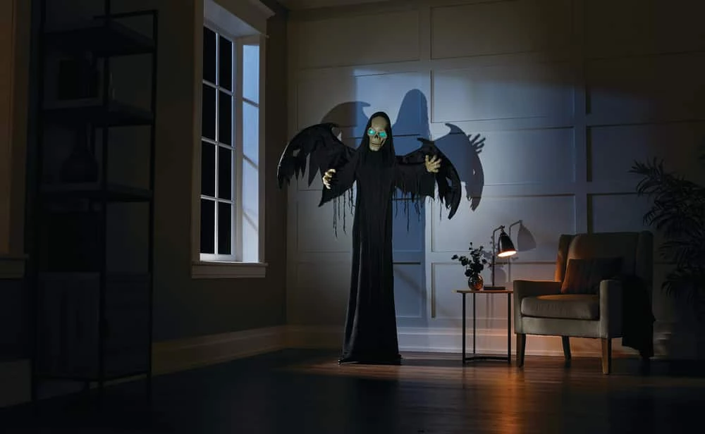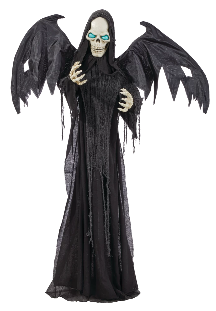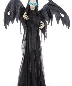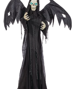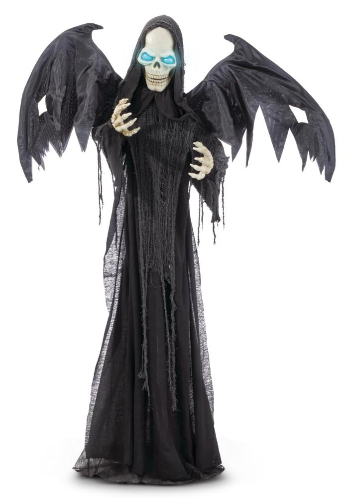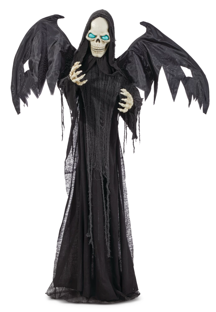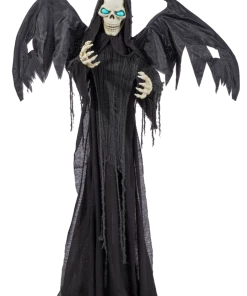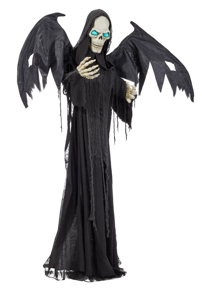 - For Living Animated Standing Reaper with Flapping Wings is sound activated and features posable arms, light-up eyes, and ghoul sounds