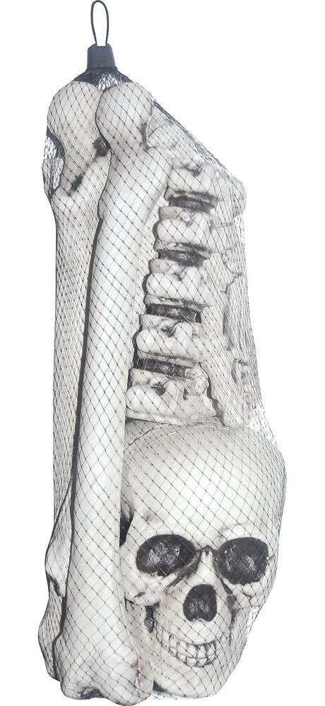 - Features a variety of white plastic bone props from a skull to a femur to a spinal column