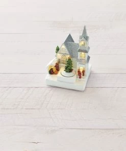 The For Living Church Village Scene will make a wonderful addition to your Christmas village decorations this holiday season. Boasting a shiny, glittery finish, this Christmas village church can be the sparkly centrepiece of your holiday mantel. The battery-operated porcelain church scene stands 8″ tall and features nine white LED lights for an ambient glow. A revolving tree adds an elevated finishing touch to this Christmas church décor. Three batteries are included for your convenience.