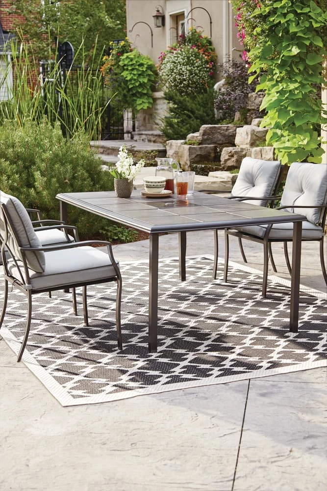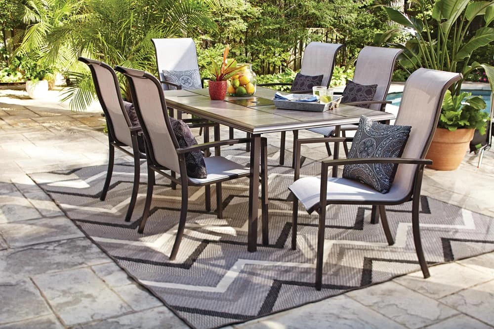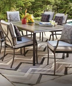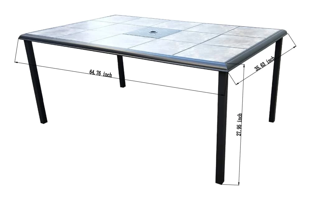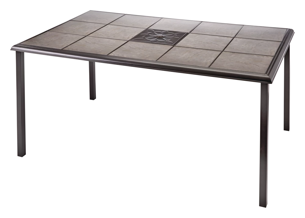 Gather your friends and family around this stunning For Living Bluebay Rectangular Steel Outdoor Patio Dining Table and enjoy dining in style this summer. The rectangular dining table features a beautiful ceramic tile top – the perfect place for your finest meals and beverages. A gorgeous centrepiece sits at the heart of the table – a true aesthetic focal point. The sturdy steel frame has a brown powder-coated, rust-resistant finish, allowing this charming piece of patio furniture to stay outdoors, even in the rain. Having multiple guests over for a barbecue or backyard dinner? This outdoor dining table measures 64″ W x 41″ L x 28″ H (163.5 x 101.5 x 71 cm) and can seat up to six guests comfortably. The table coordinates well with the For Living Bluebay Mix + Match pieces. Simply select the chairs or accessories you need to create a patio furniture set that’s perfect for you. For those looking to complement with a suitable table cover, the Large Oval Dining Set Cover (0881879) and Large Dining Table Cover (0881937) are fantastic options.