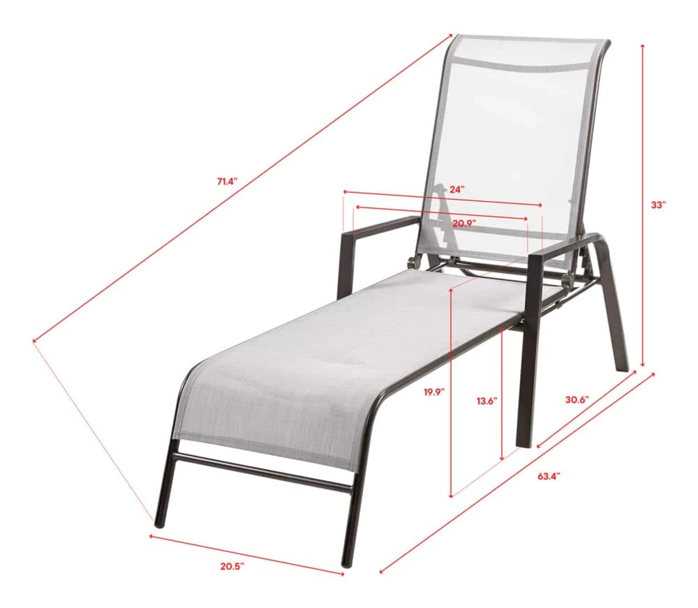 With a comfortable sling back and seat, the For Living Bluebay Sling Outdoor/Patio Chaise Lounger is the perfect addition to your porch furniture and patio sets. This sling lounger has a durable heavy-duty steel frame that will last summer after summer, plus a powder coating that protects it from the elements. A fully adjustable back rest lets you decide whether to sit upright or to rest in repose under the summer sun – simply adjust the lever and kick your feet up. While intelligently engineered for maximum comfort, the sling back and seat of this quality grey patio lounger are also durably constructed and weather resistant, drying quickly after it rains. The lounger is also a breeze to clean with a damp rag, and easy to install within minutes of being taken out of the box – no exceptional skills or tools required. Weighing just under 22 lbs, this high quality chaise lounger can be easily picked up and moved around your outdoor oasis as needed. It coordinates well with other pieces in the Bluebay Collection, so you can create a full, stylish outdoor seating experience in your backyard.