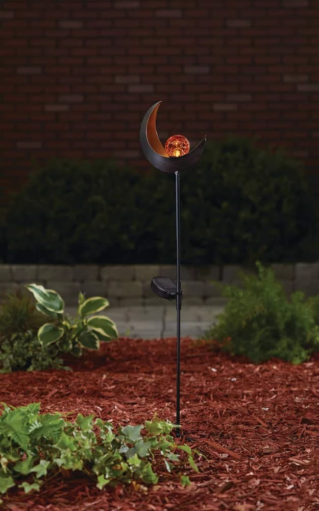 Featuring a sliver of a moon on the top, accompanied by a warm LED solar light, the For Living Solar-Powered Moon Stake adds an elegant, sophisticated look to your garden or outdoor space. The durable solar stake light features a metal construction for easy mounting in the ground and exceptional durability in outdoor conditions. Each garden solar stake measures 35-inches tall and offers up to eight hours of light when fully charged.
