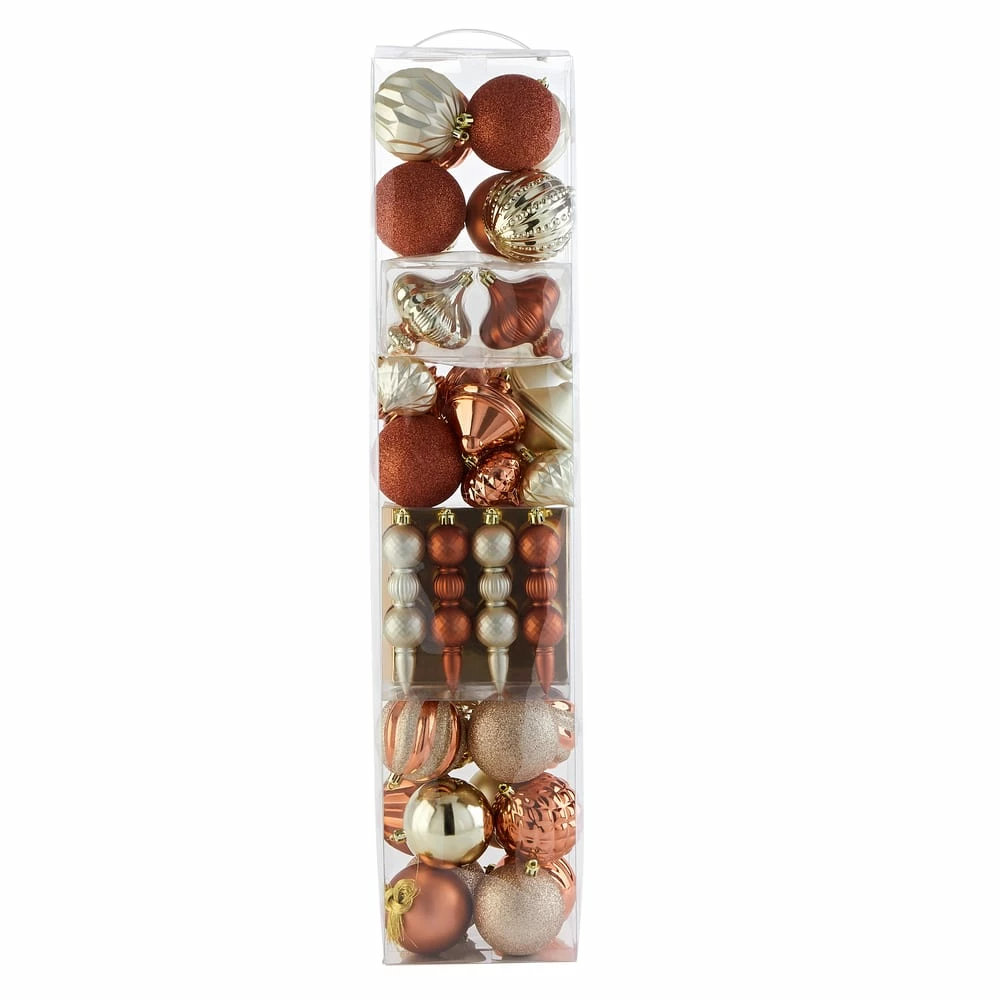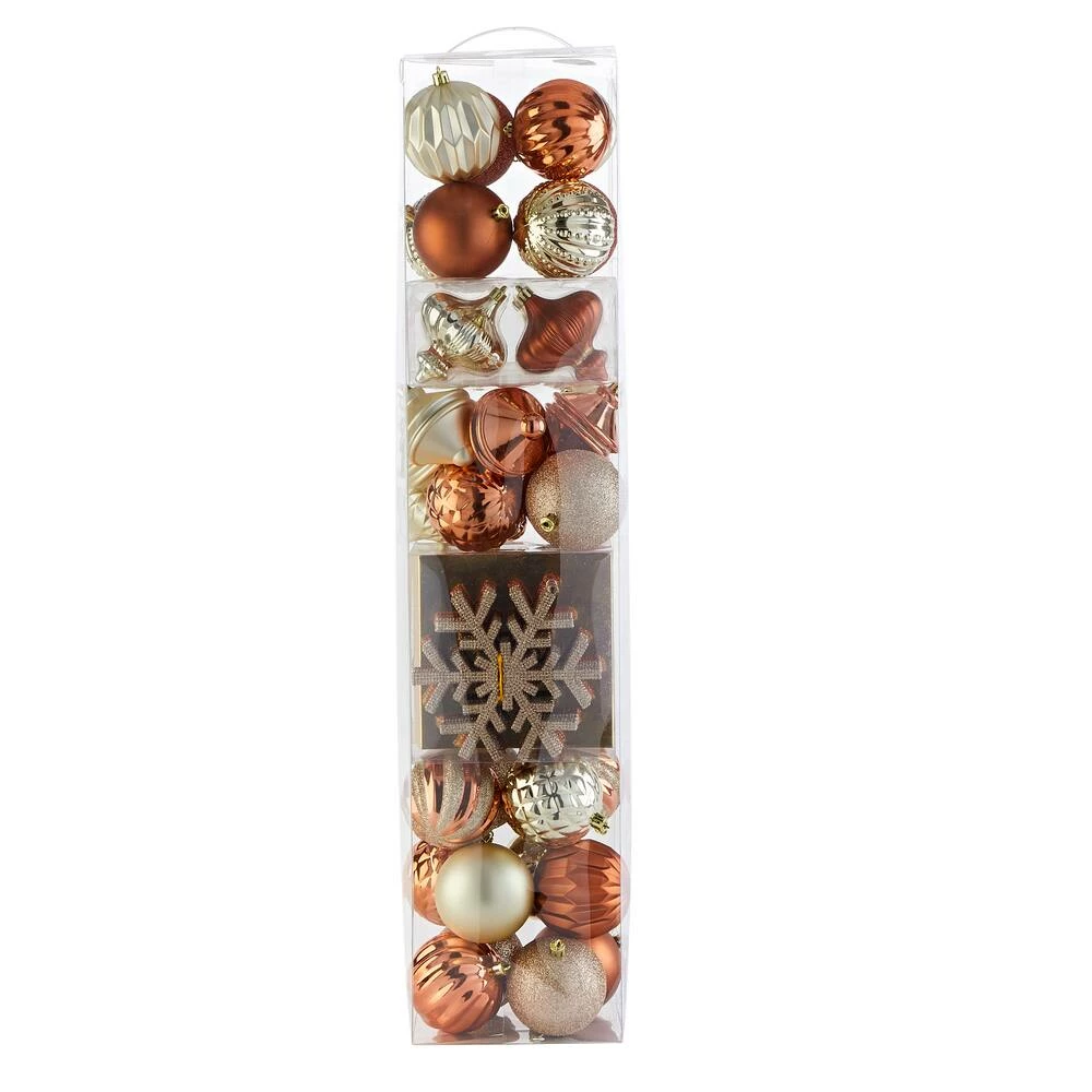The CANVAS Gold Collection Mixed Shape Shatterproof Ornament Set helps you deck the halls in style. These festive Christmas ball ornaments come in different shapes, sizes and patterns with unique glitter, matte, or metallic finishes. With 52 ball ornaments, this set has more than enough to make a stylish seasonal statement on your tree, mantel, or displayed in a clear bowl. The shatterproof material ensures safe and durable use for many seasons to come.