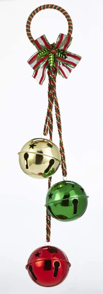Welcome guests to your home this season with the cheery sound of bells from the For Living Festive Bell Door Hanger. This charming door hanger features three bells suspended at different lengths on braided red, gold and green cords held by a hanging ring. Finished with a festive bow and easily hung, the Christmas bell hanger has one red, one green and one gold bell that jingle a welcome to every guest.