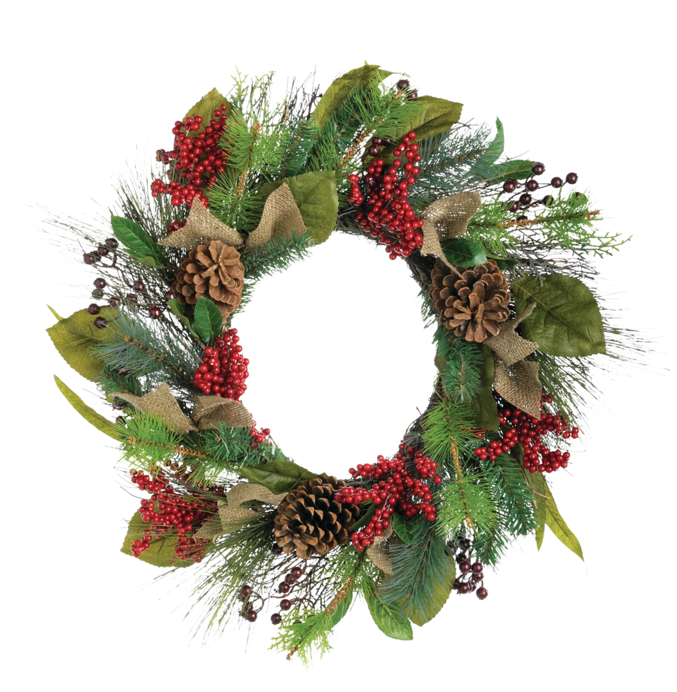 - The For Living Artificial Christmas Wreath with Pinecones, Berries & Burlap Bows has a classic style that will add some rustic charm to your seasonal décor