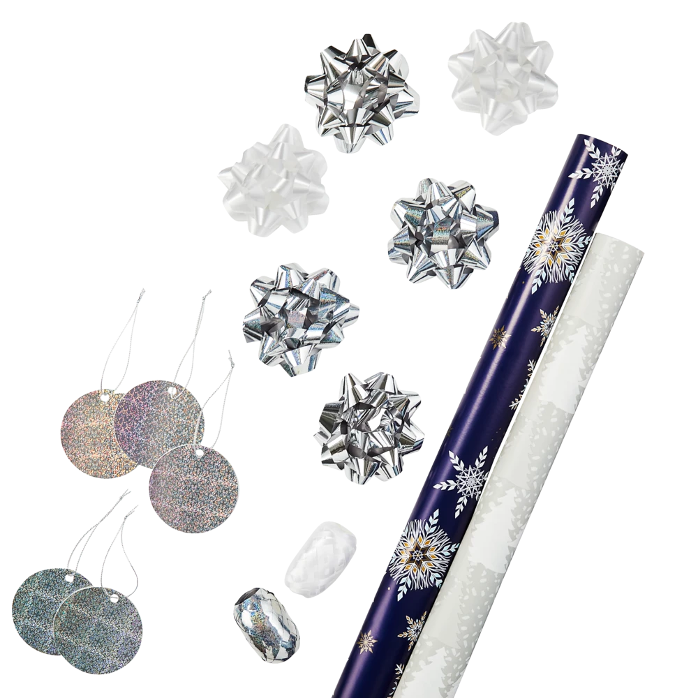 - Kit includes (2) 30″ x 150″ (76 cm x 4 m) gift wrap rolls, (6) 3″ (7.6 cm) bows, (2) 3/16″ x 32″9″ (5mm x 10 m) ribbons, and (6) tags