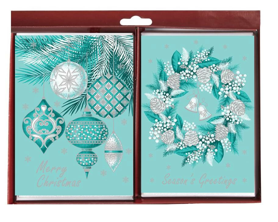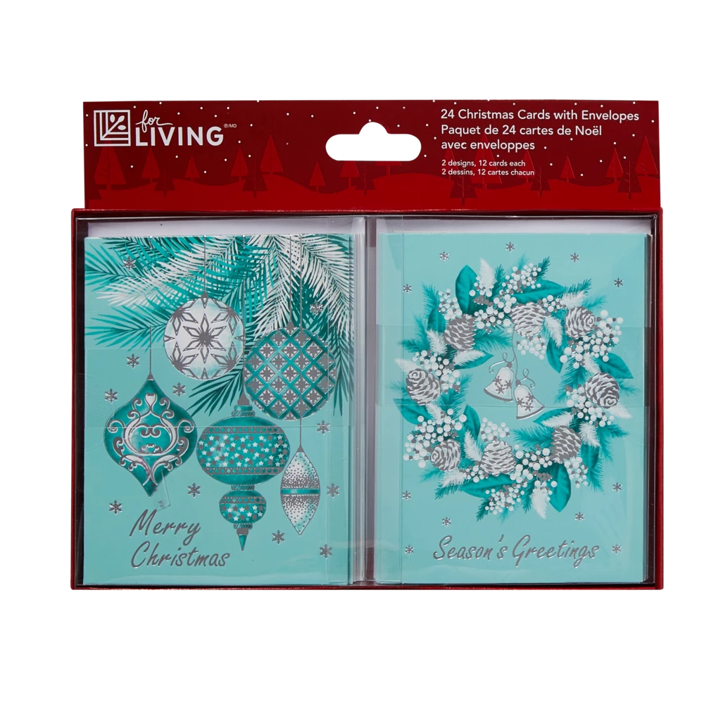 Spread cheer this season with this set of For Living Holiday Cards. With a classic holiday design, these seasonal cards deliver a joyful message to their recipients. Measuring 3.875″ x 5.125″ when folded, this set of 24 individual cards comes in two designs, with 12 cards per design. Each high-quality card has plenty of room for writing your holiday greetings and comes with a matching envelope. Designs are written in English only.