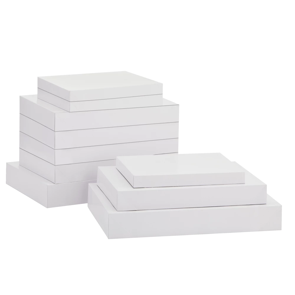 Easily wrap even the most delicate gifts with the For Living Holiday Gift Box. The pack of 10 holiday gift boxes comes with an assortment of sizes, perfect for wrapping everything from ties to photo frames. The white gift wrapping box is the perfect blank canvas for your favourite holiday paper or gift bag. Build each Christmas gift box as you need it and easily store the rest for another occasion.