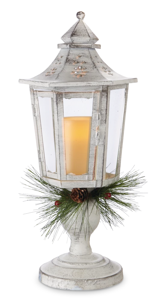 The For Living Cream Lantern with Battery Operated LED Candle is designed to add some rustic holiday charm to your home décor this winter season. Featuring a 17″ tall body, this free-standing Christmas lantern boasts a lightly distressed white finish with faux greenery and berry detailing. An LED candle inside the metal lantern delivers an ambient glow that looks wonderfully warm on your dining table, side table or coffee table.