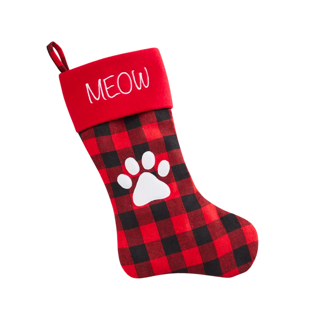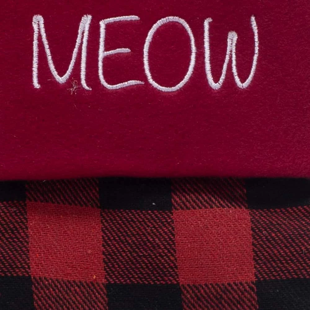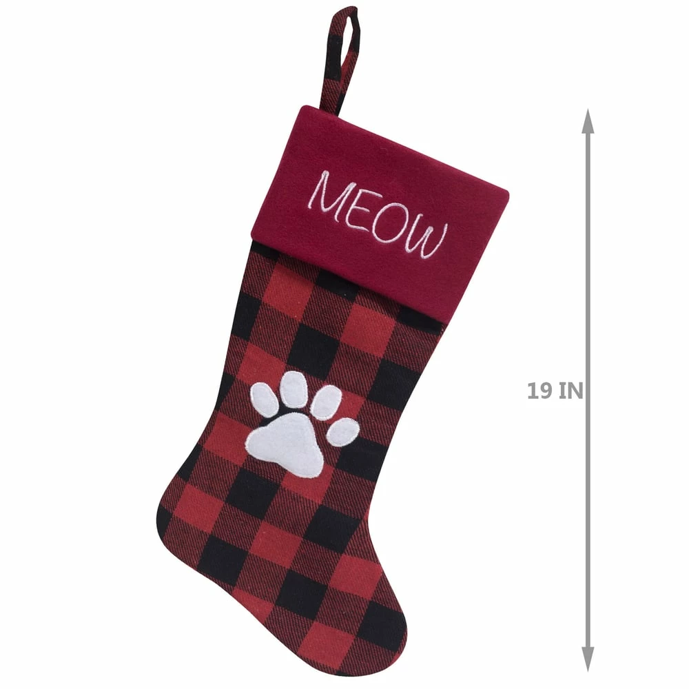 Treat your feline to some festive holiday cheer with the For Living Meow Stocking. Made from high-quality polyester, this red and black Buffalo plaid cat stocking has a stamped paw print design. It fits wonderfully on any mantle or fireplace, letting all your guests know how much you love your cat. This decorative fabric Christmas stocking measures 18 inches, with a durable loop for hanging anywhere in your home.