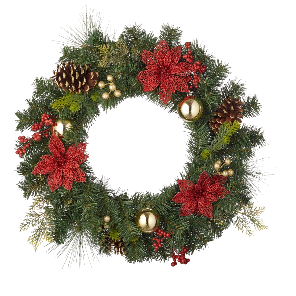 Ring in the holidays with the For Living Mixed Pine Wreath. Pre-decorated with a realistic assortment of PVC greenery and red poinsettias with sparkling leaves, this Christmas pine wreath is an instant holiday classic. Measuring 22-inches in circumference, this majestic Christmas wreath comes with an assortment of decorative pinecones and looks great on your doors, walls, and mantles. Guests are sure to love this festive holiday marvel, and so is your family.