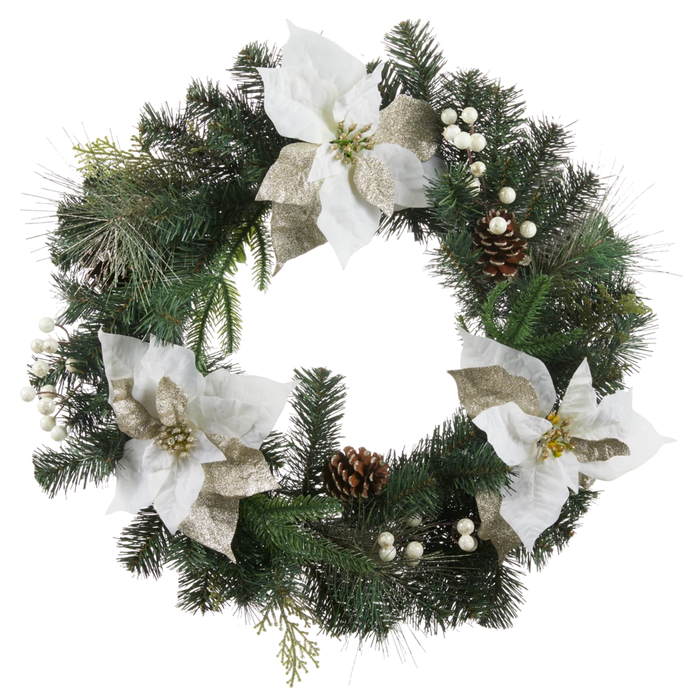 Ring in the holidays with the For Living Mixed Pine Wreath. Pre-decorated with a realistic assortment of PVC greenery and white poinsettias with sparkling leaves, this Christmas pine wreath is an instant holiday classic. Measuring 22-inches in circumference, this majestic Christmas wreath comes with an assortment of decorative pinecones and looks great on your doors, walls, and mantles. Guests are sure to love this festive holiday marvel, and so is your family.