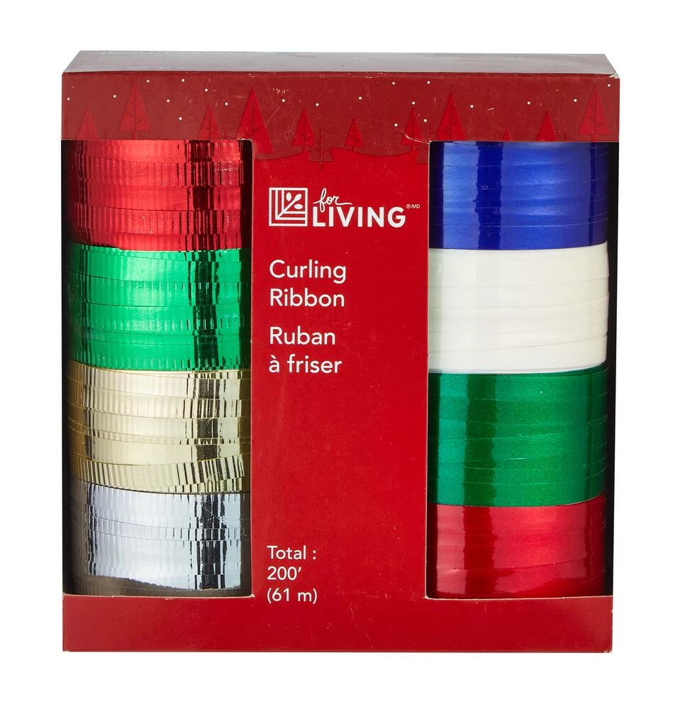 Add a festive finishing touch to your special holiday gifts with this For Living Christmas Ribbon. Each pack includes eight rolls of durable ribbon in an assortment of classic seasonal colours. These decorative Christmas ribbons feature a variety of lacquer, metallic, and metallic-crimp textures to help elevate the look of your Christmas giftwrap. Transform the 3/4″ x 200′ ribbon into bows or curl it to add fun seasonal style to your holiday packages.
