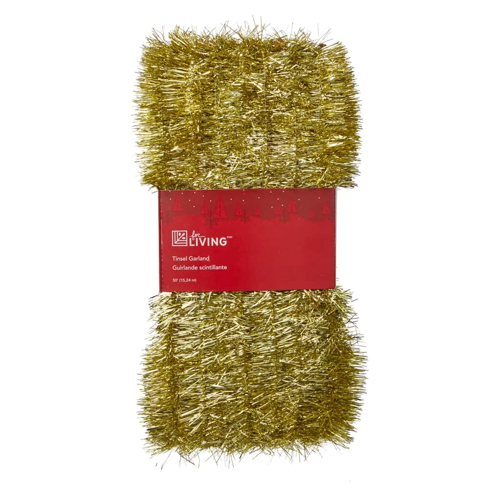 - This For Living Gold Tinsel Garland adds seasonal sparkle to your tree, banisters, mantel and more this holiday season