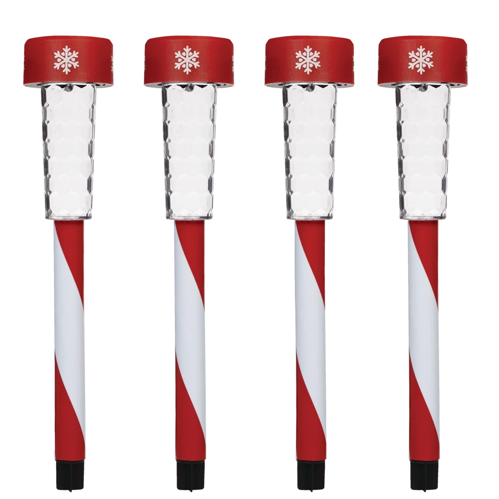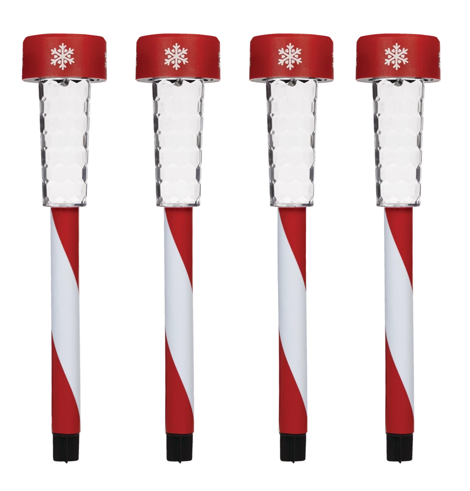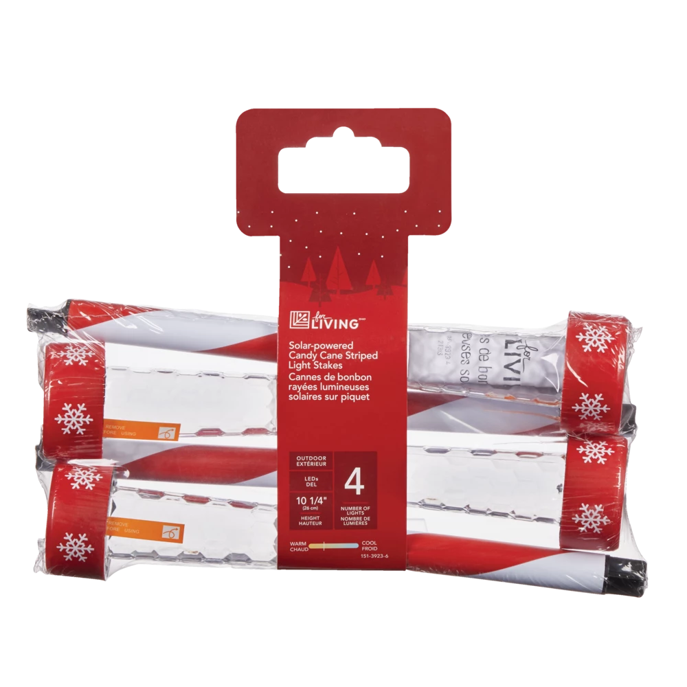 Light up your path, walkway, garden, or yard with the For Living Solar Candy Cane Stakes. With four stakes in each pack, these solar candy cane stakes make it easy to illuminate your outdoor space. They conveniently charge through the built-in solar panels in both sunny and cloudy weather, so you never have to worry about replacing batteries. Each Christmas pathway light will run for up to eight hours on a full charge.