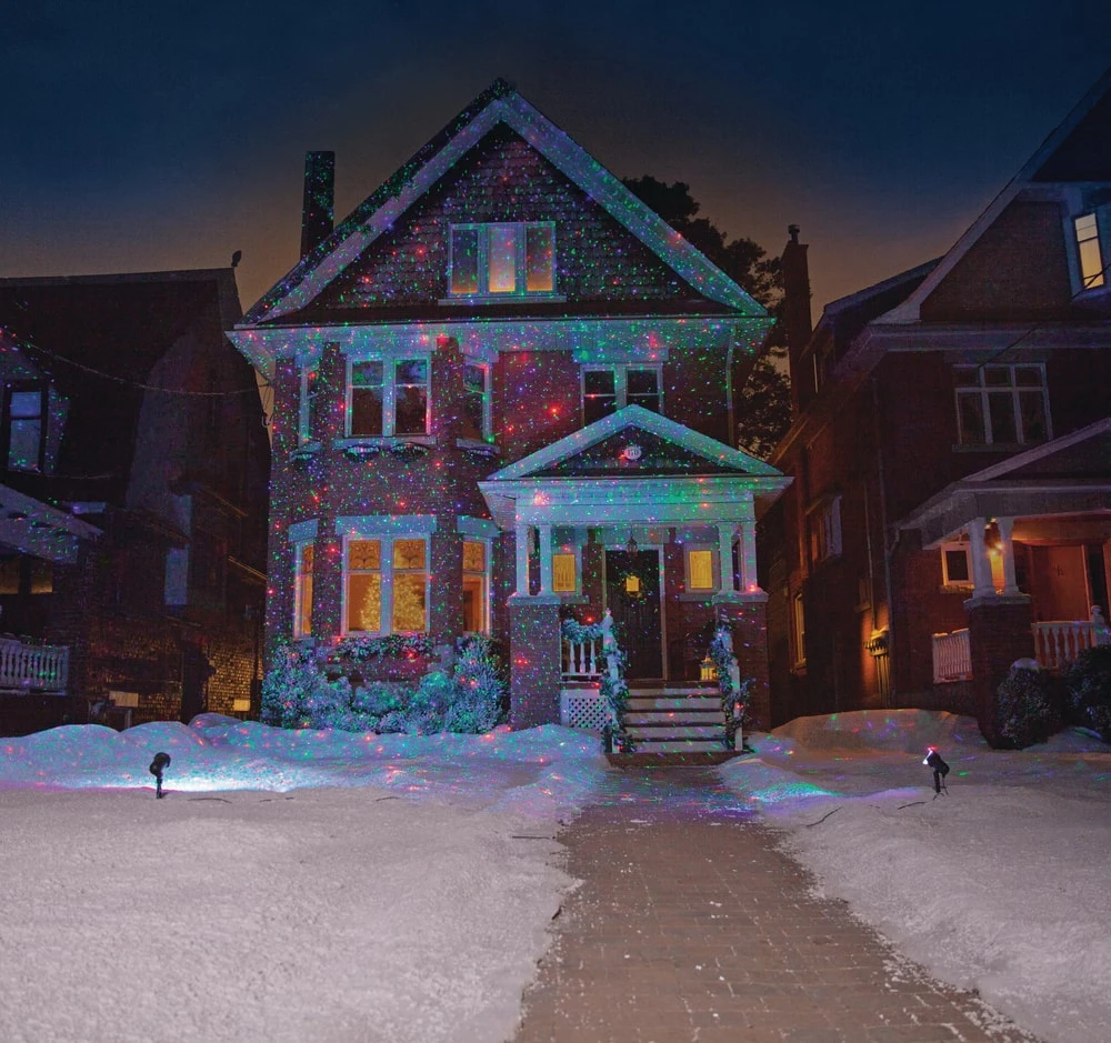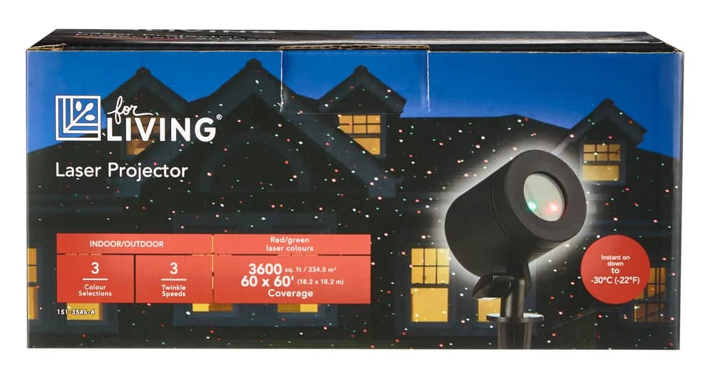 Featuring low, medium, and high twinkle options and red and green colours, the For Living Static Laser creates a festive holiday light show in your yard. This static laser projector covers up to 3600 square feet, illuminating your entire space in a sea of red and green lights. This Christmas light projector is suitable for indoor or outdoor use – it can function down to -30 degrees Celsius and includes a ground stake for installation.