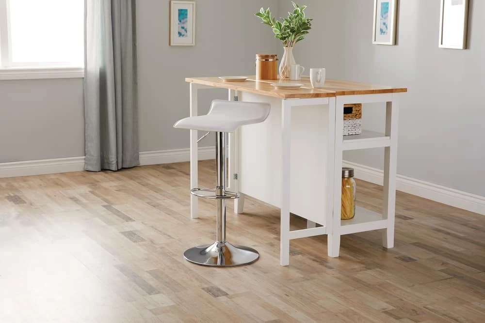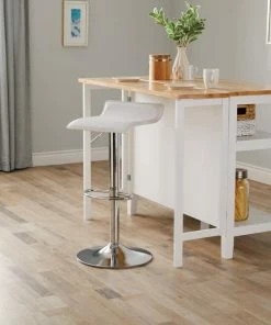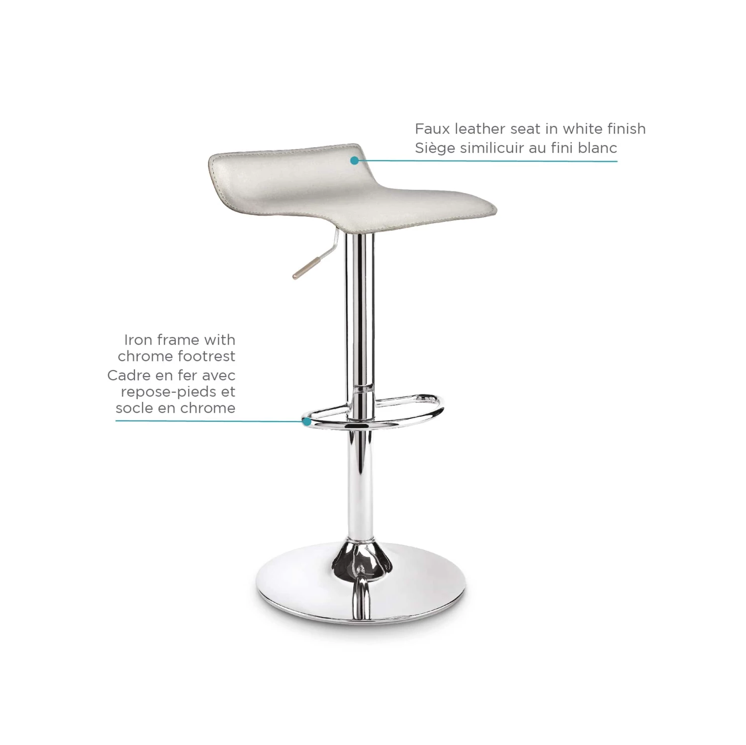 A must-have for any contemporary bar or dining room table, the For Living Adjustable Bar Stool is a versatile bar stool that effortlessly complements your modern or traditional home decor. This adjustable bar stool features a lever on the side to tailor the seat height to your bar or table, resulting in a more comfortable seating position for each individual. This stool can be adjusted from 26″ to 35″ tall and features a swivel seat for easy access. With a small backrest, this bar stool offers the support you need without being bulky or uncomfortable, which also makes it easy to tuck under your table or bar to help save space when not in use. With a chrome finish base and white seat, this bar stool has an attractive aesthetic that would fit right in at a retro diner or at the bar of a fine-dining establishment. Whether you need some extra seating at your breakfast bar or island, or you simply want to add some sleek style to your dining room, this adjustable bar stool is sure to impress.