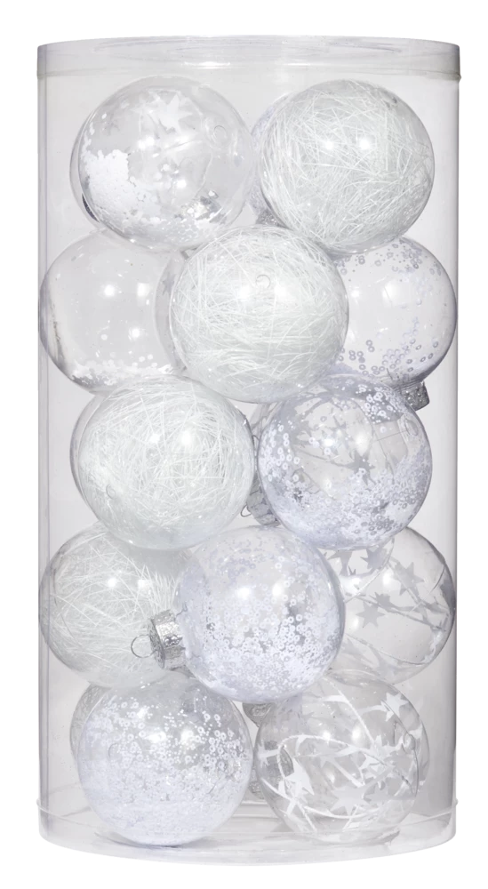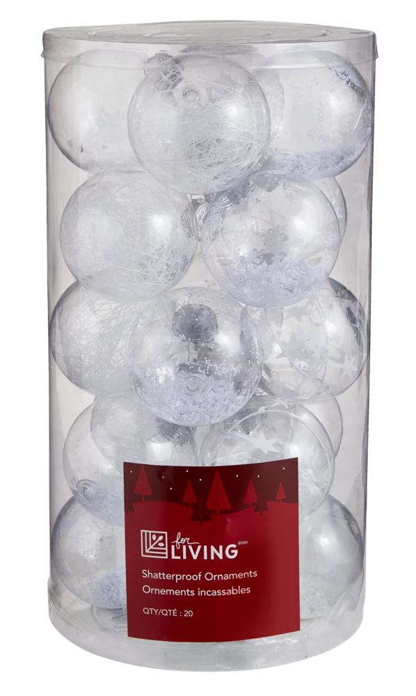 - Add shine to your holiday decorations with the For Living Clear with White Fill Shatterproof Ornament Set
