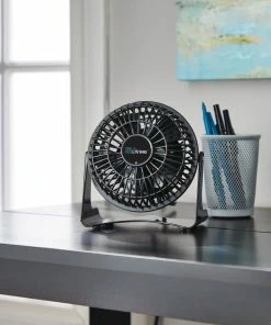 Made to fit in small spaces, the For Living Compact Personal Table/Desk Fan will provide you with a refreshing breeze wherever you need it. This indoor fan has a single speed setting that delivers consistent airflow, while the adjustable tilt function allows you to direct it to suit your needs The 4″ (10.2 cm) lightweight black table fan has a durable ABS body and blade, making it a great option for steady everyday use.