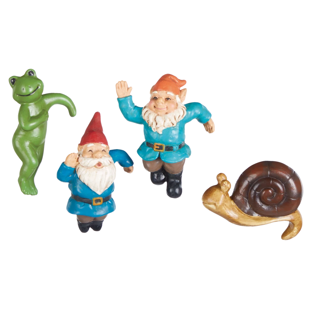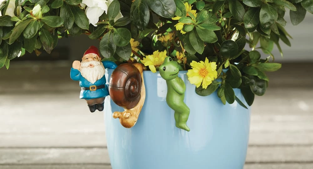 - The For Living Decorative Frog, Snail, and Gnome Pot Holders are made from a durable resin material for long-lasting outdoor use