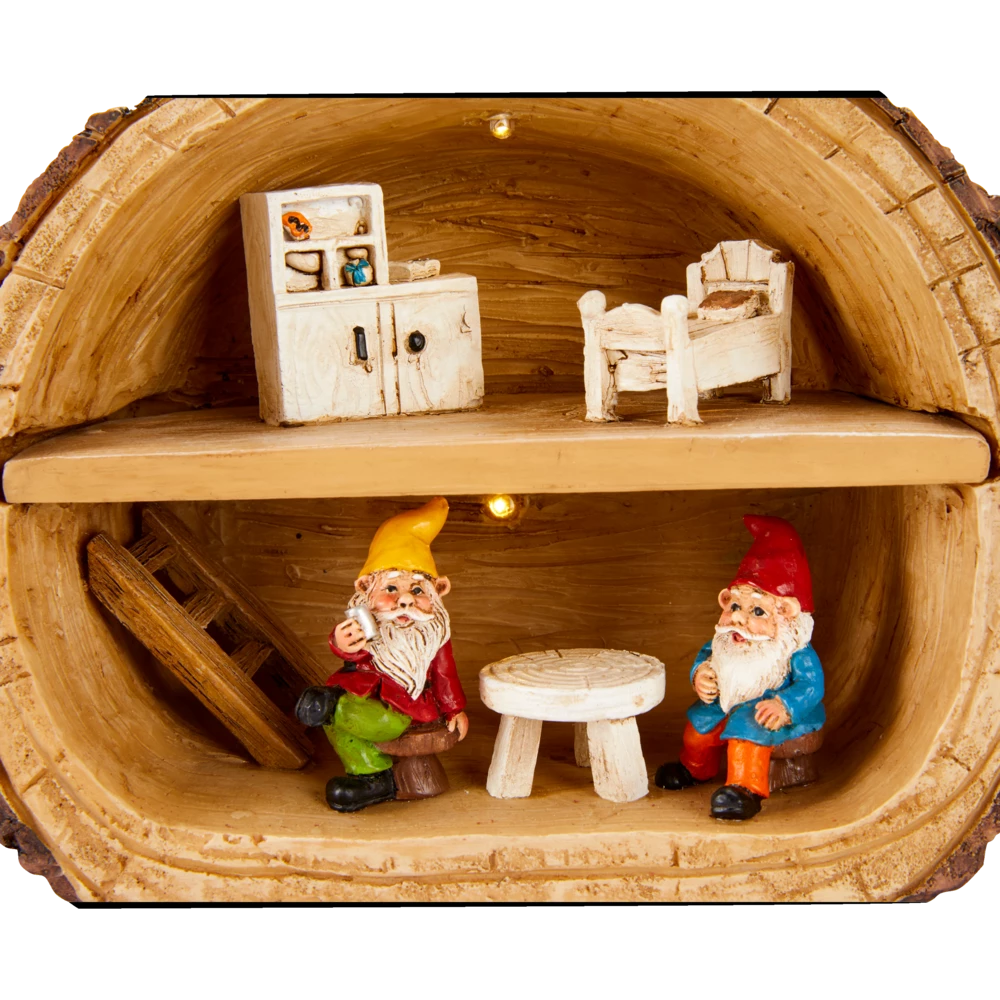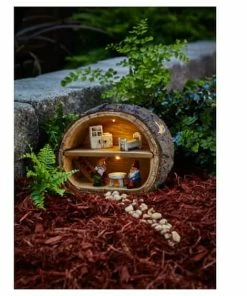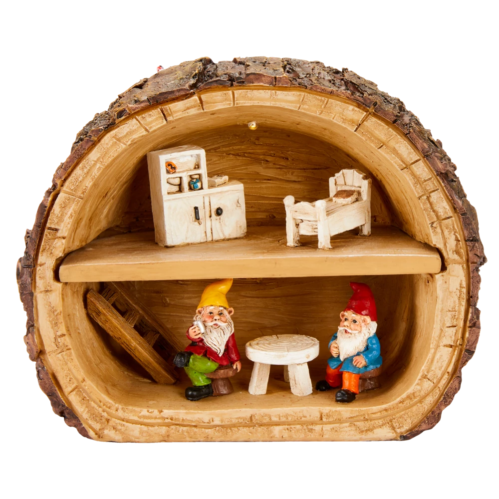 Featuring a selection of miniature woodland pieces including a log cabin, two gnomes, a bed, dresser, table, and two solar lights, the For Living Enchanted Gnome Cabin Garden Kit is a must-have for any whimsical garden. This gnome garden kit can be arranged in many different ways in both indoor and outdoor environments, providing a cheerful aesthetic sure to please friends and family. To clean, wipe down each piece with a damp cloth.