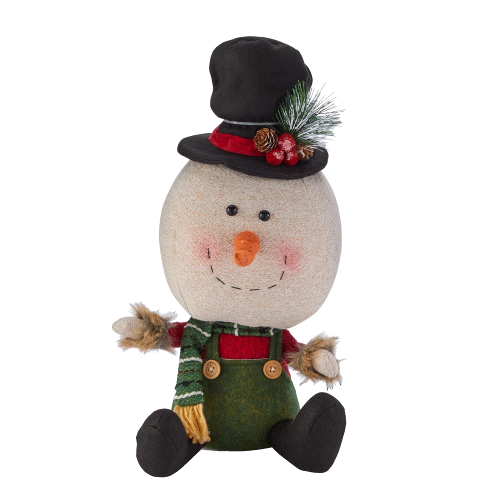- Plush big head sitting snowman bundled up with a hat, overalls, scarf and black boots