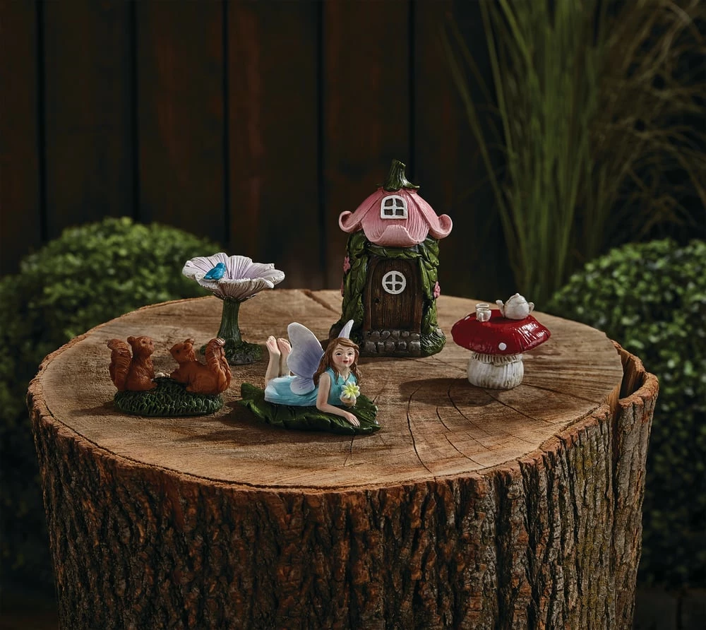 - Kit includes a pink house, reclining fairy, table and tea set, squirrels, and bird bath