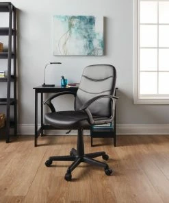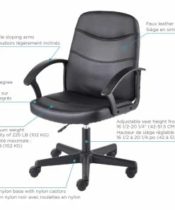 The For Living Faux Leather Adjustable Office Chair comes loaded with features to help make spending time sitting in your office or home office more enjoyable. A comfortable office chair can be the difference between a good workday and a bad workday, and this one has your back. The easy-to-clean faux leather upholstery has a versatile aesthetic that easily complements any home or office decor, while the cushioned seat delivers added comfort where you need it most. With loop arms, a 360-degree swivel seat, and a convenient lever on the side to adjust the height, this faux leather desk chair is built to keep you comfortable through long hours at your desk. The castors allow you to roll around your workspace with ease, while the backrest lets you sit back and relax with uncompromising support. The adjustable height feature makes it easy to achieve custom comfort with a seat-height range of 16-1/2″ to 20-1/4″ tall to complement the height of the user and the desk. Take your home office to the next level with this stylish, versatile computer chair.