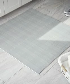 - The For Living Faux Linen Floor Tile features a modern grey linen-like surface with an interlocking design for easy installation
