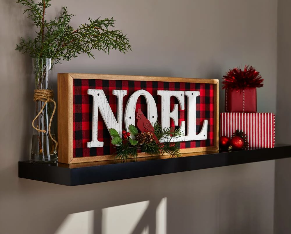 The For Living Wood and Buffalo Check Noel Sign combines the very best of rustic charm with a festive look. This eye-catching wood noel sign can be hung or placed on tabletops or mantels. The buffalo plaid background pops behind the prominent white “Noel” lettering to coordinate with your stylish seasonal decor. In front, you’ll find pinecones and evergreen sprigs with a wooden cardinal cut-out adding a whimsical, natural touch.