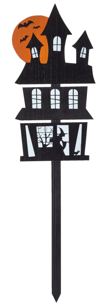 - For Living Haunted House Yard Stake features a haunted house with a witch