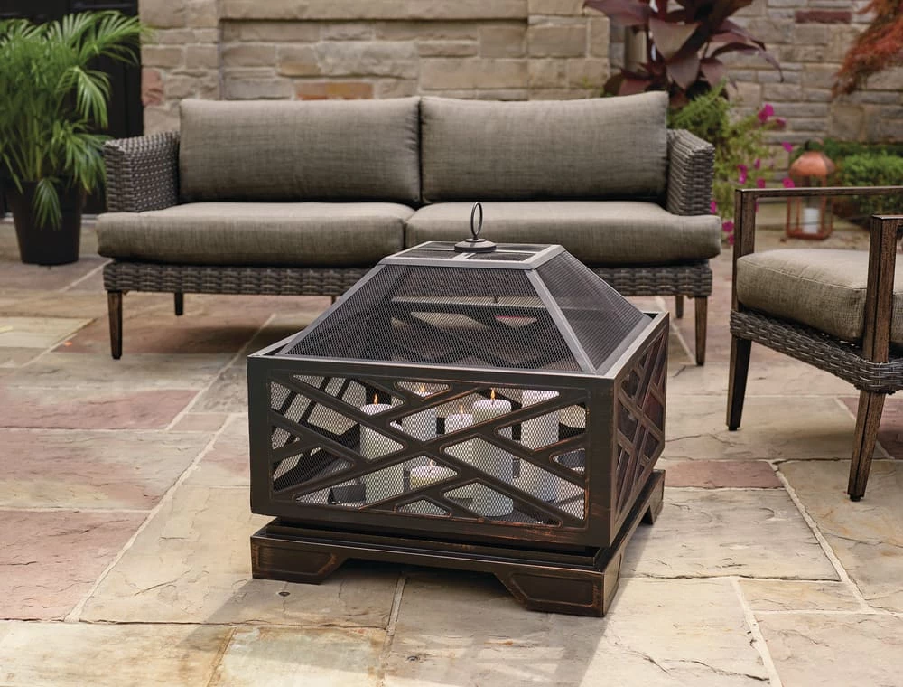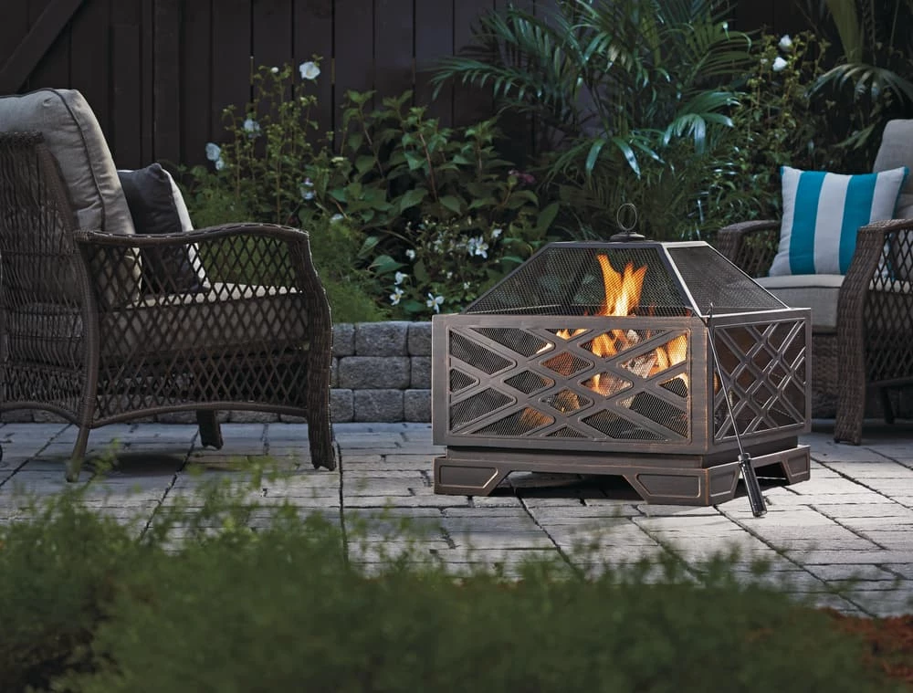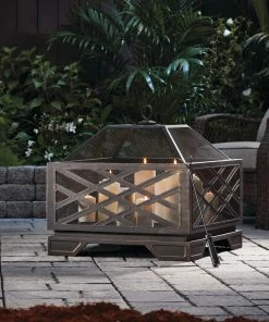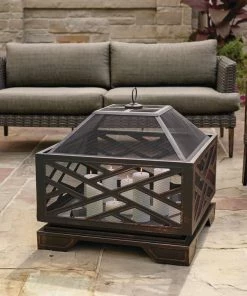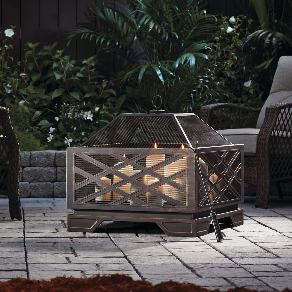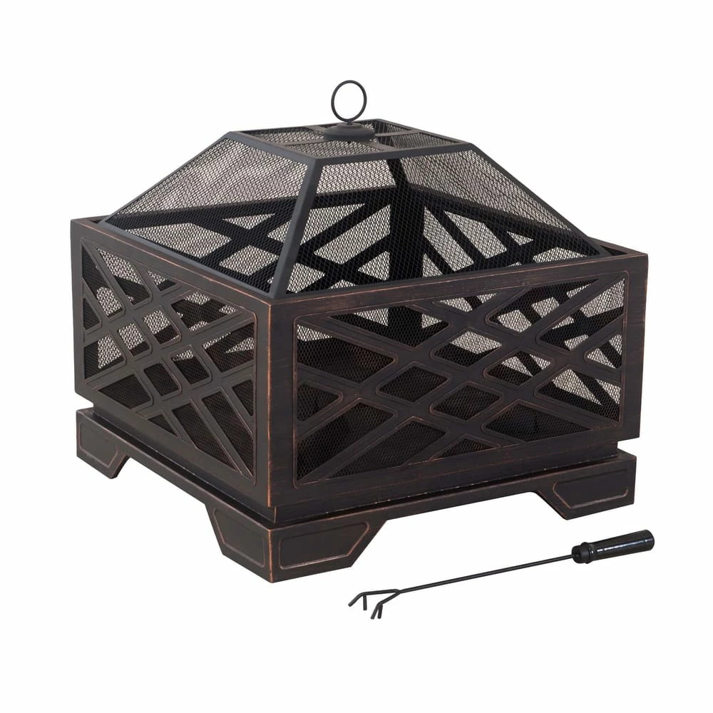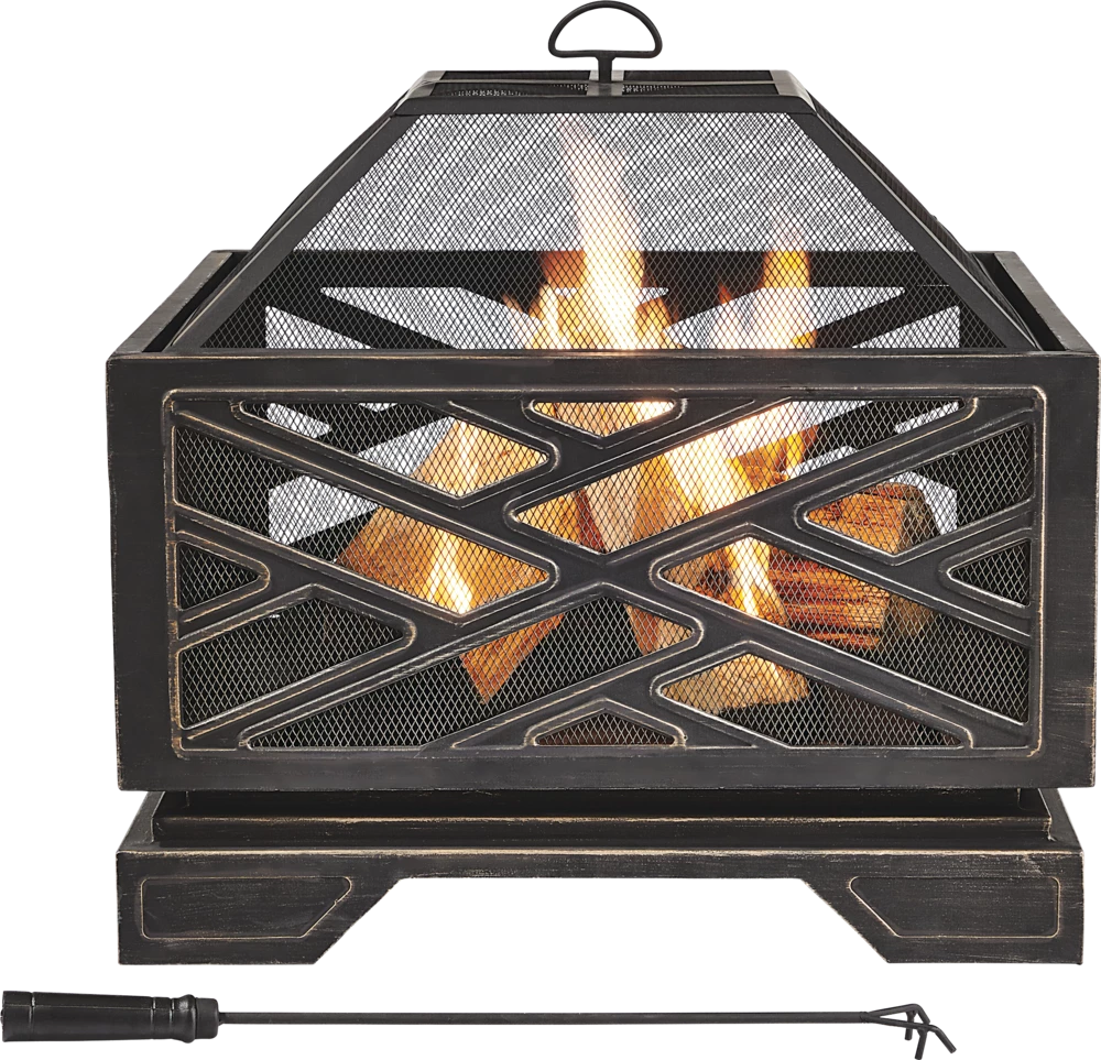 The For Living Lawrence wood burning fire pit is designed for making lasting outdoor memories. With its durable steel construction and stylish antique bronze finish, this square firepit is sure to provide years of entertainment for all of your backyard gatherings. This outdoor fire pit is easy to assemble and can be transported wherever you want to get the fire started. The decorative cut-outs increase heat distribution while giving you and your guests an impressive view of the fire inside from every angle. The Lawrence backyard fire pit comes with a mesh screen to help keep flames and embers safely contained. It also includes a poker for adjusting logs and kindling and to safely remove the spark guard when tending the fire. This wood burning fire pit is a fun addition to any patio or yard when it’s time to make s’mores with the kids or enjoy summer evening drinks with friends. The sturdy and attractive steel fire pit can also be used to display candles. With its generous 26″ height, width and depth, it’s an ideal size for creating a warm and relaxing outdoor oasis. Note that due to the handcrafted nature of this wood firepit, the colour of the actual product may vary slightly.