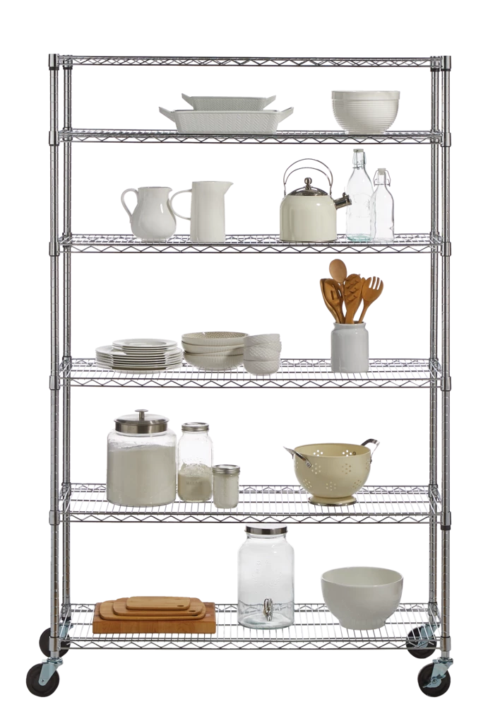 The For Living Heavy-Duty 6-Tier Wire Shelf with Castors provides a reliable solution for spaces that might have limited storage, such as the kitchen, laundry room or basement. It features five fully adjustable wire storage shelves that can be moved up or down in 1″ (2.5 cm) increments so that you can completely customize this shelving unit to your needs. The rolling castors allow for easy transport and are removable if you’d like to keep the shelves in a permanent position. Made with a sturdy steel frame, this metal baker’s rack is rust-resistant for use in a variety of home environments. The durable frame is further treated with a scratch-resistant chrome finish that stands up to daily wear and tear and matches easily with most home décor schemes. Each of these heavy duty wire storage shelves is able to hold up to 600 lbs (272 kg), which means you can load them up with your household items such as pantry staples like canned food and sacks of flour and potatoes in the kitchen, detergent bottles, steel tools and seasonal décor in the garage, clothes and shoes in the closet, and so much more. Easy to assemble, these wire adjustable shelves comes together in minutes with no tools required. Make your space more functional with this versatile and long-lasting metal storage shelf.