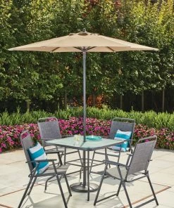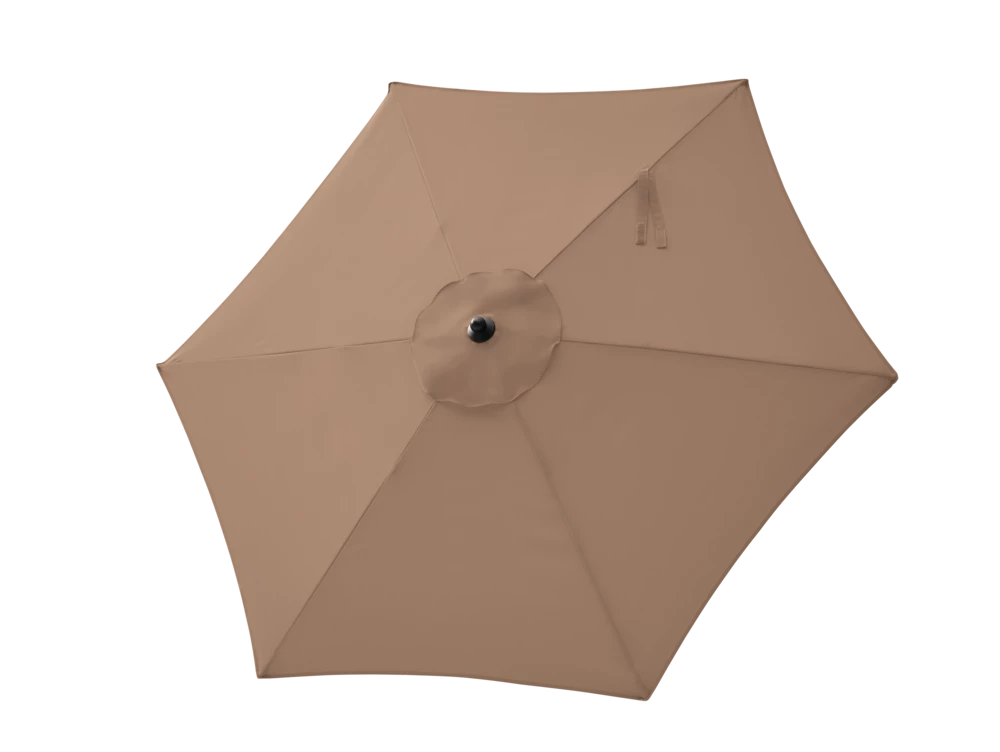 Help keep you and your guests shaded while adding a bright spot of colour to patios or outdoor spaces with this For Living Outdoor Market Patio Umbrella. It features a durable, rust-resistant steel pole with dark metal ribs and a generous 7′ beige polyester shade that’s designed to resist rain and fading. This stylish outdoor patio umbrella is equipped with a Velcro strap to secure the closed umbrella and a fabric carrying bag for easy storage and transport.