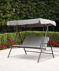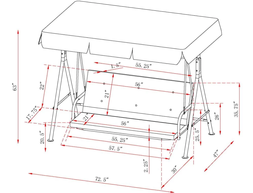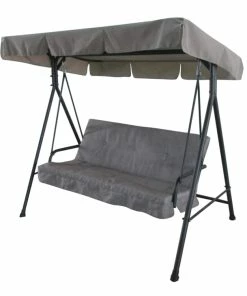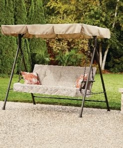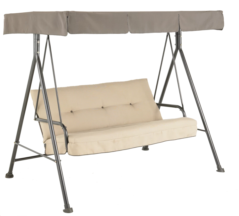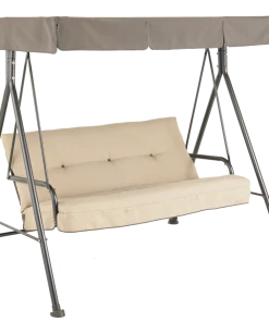 Imagine reclining on this lovely For Living Parsons Collection Outdoor/Patio 3-Seater Swing with Canopy and Cushions and winding down on a summer day with your favourite book. Featuring a heavy-duty steel frame that is powder-coated for added durability, this patio swing with canopy comfortably sits three people. Made of strong polyester fabric, the canopy of this seat swing can be tilted to provide maximum shade depending on the time of day and the amount of sunshine outside. It’s durable and weather-resistant, too, letting you enjoy your swing season after season. The fabric of the swing set’s impressive awning has a pleasing neutral beige colour that will coordinate well with the rest of your yard or patio furniture. Complement this patio swing 3 seater with other pieces from the For Living Parsons Collection. The entire unit measures 47.2″ x 72.4″ x 63″ (119.8 x 183.8 x 160 cm) and can support weight up to 606 lbs (275 kgs). The swing is easy to assemble and comes with two plush matching cushions for added comfort.