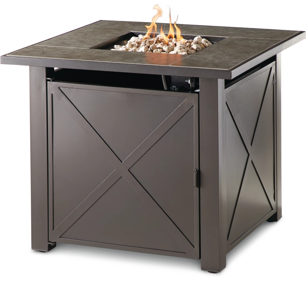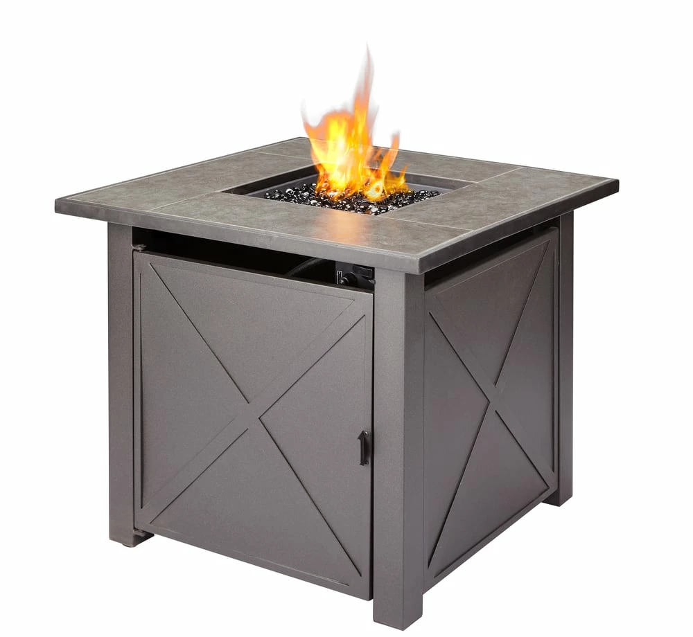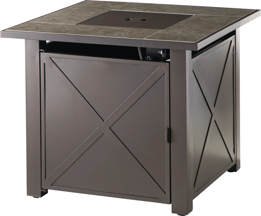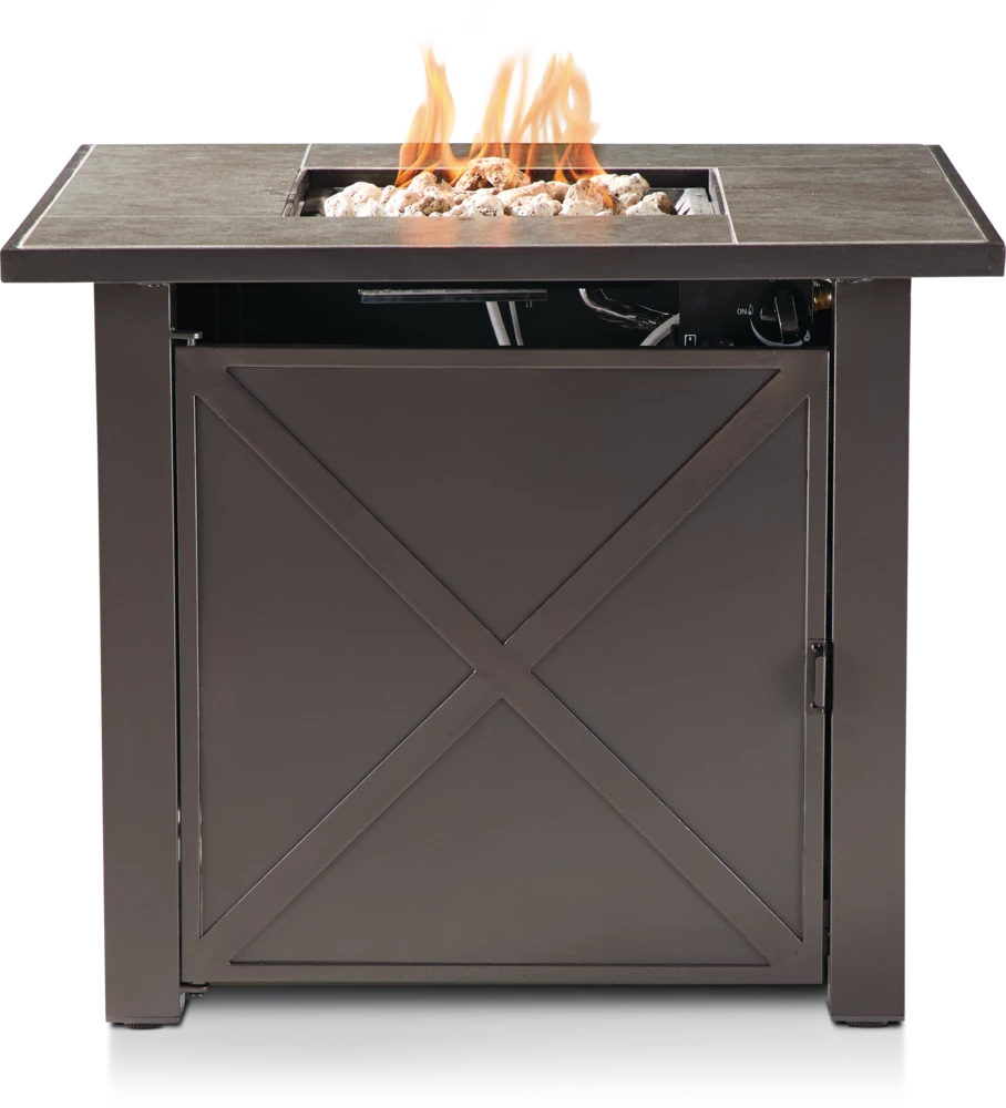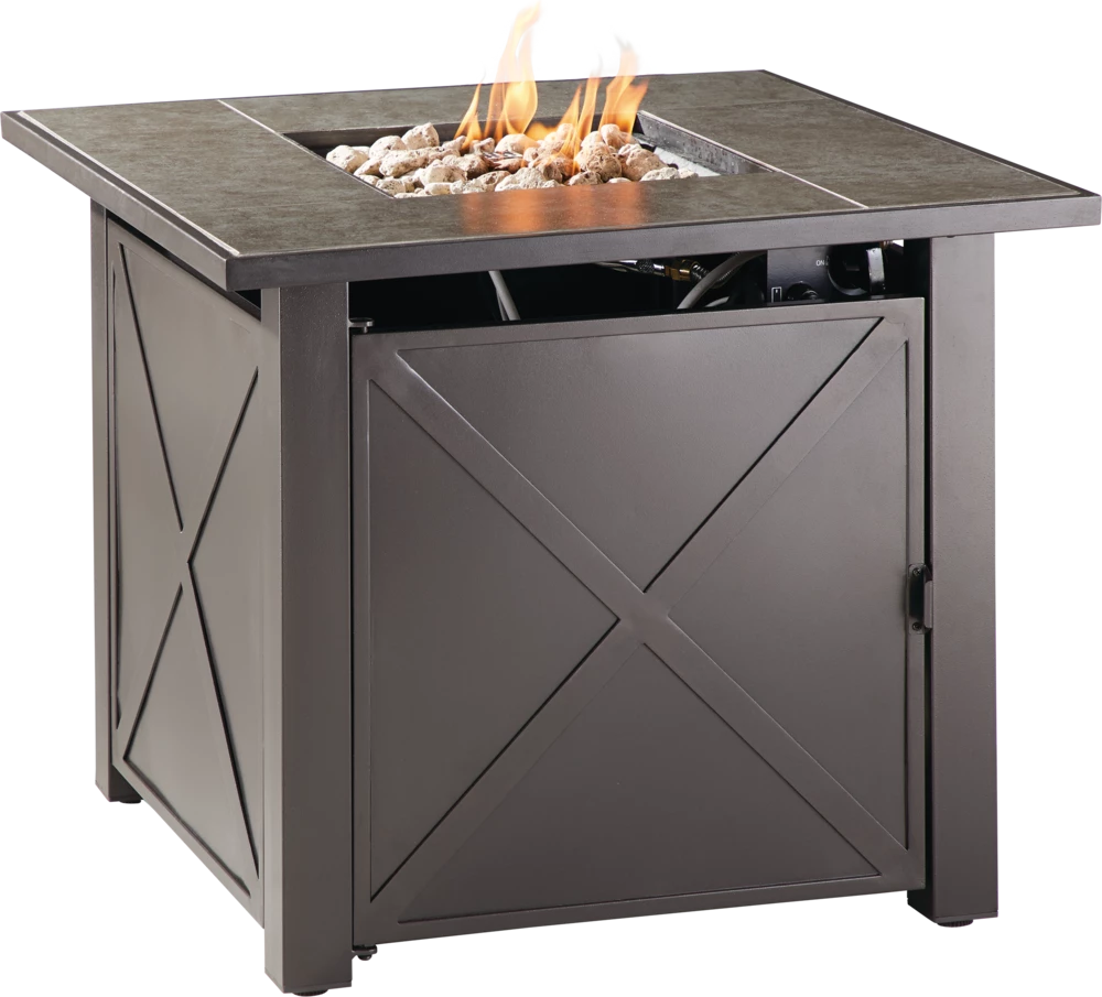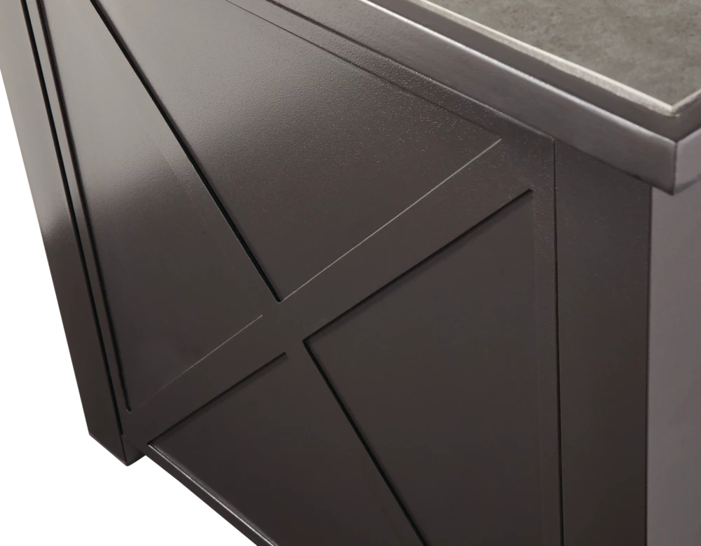 The For Living Plateau fire pit table is a fashionable and functional addition to your outdoor living space. It’s a great spot to gather around with friends and family in any season, whether you’re hosting a backyard get-together or looking to create a cozy outdoor oasis. This sturdy steel fire table is built to last with a durable steel burner so you can enjoy years of comfortable outdoor entertaining. The multi-purpose design features a central gas firepit capable of producing up to 40,000 BTUs and a burner lid that covers the centre for more useable surface space when the firepit isn’t in use. The space-saving tank-in style of this gas fire pit table conceals your propane tank for a cleaner look on your patio or in your yard. A standard 20lb (9 kg) propane tank, sold separately, is required for operation. Black fire glass beads are included with the Plateau firepit table for a sleek, modern look and to help amplify the heat with their reflective surfaces. An attractive “X” design on the side panels adds subtle style to this backyard fire pit without distracting from the main attraction—the warm glow of the fire.