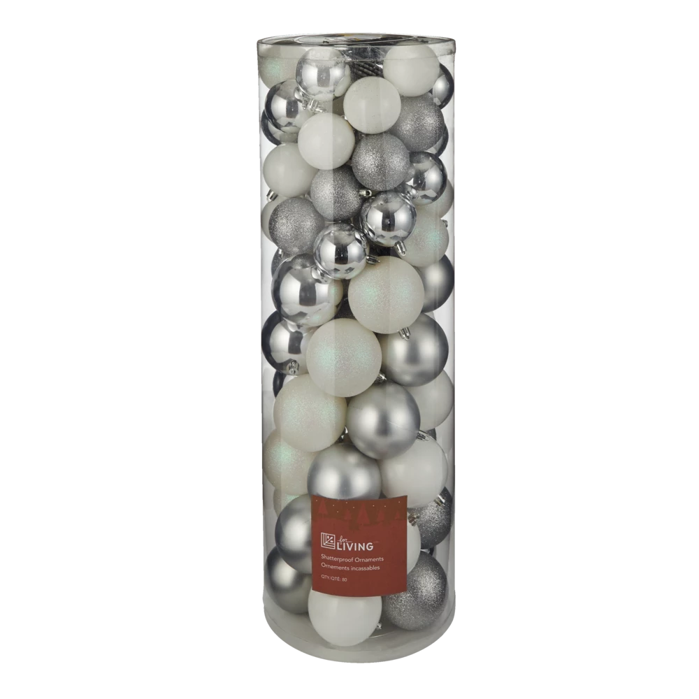 Bring style and elegance to your holiday décor this season with the For Living Unbreakable Ornament Set. This silver ball ornament set features 80 shatterproof ornaments that are ideal for placement around your Christmas tree, along mantel or staircase garland, or on display in a decorative bowl or tray. With a mix of sizes and hues and a range of matte, shiny and glitter ball ornaments, this Christmas decoration set delivers an eye-catching look.