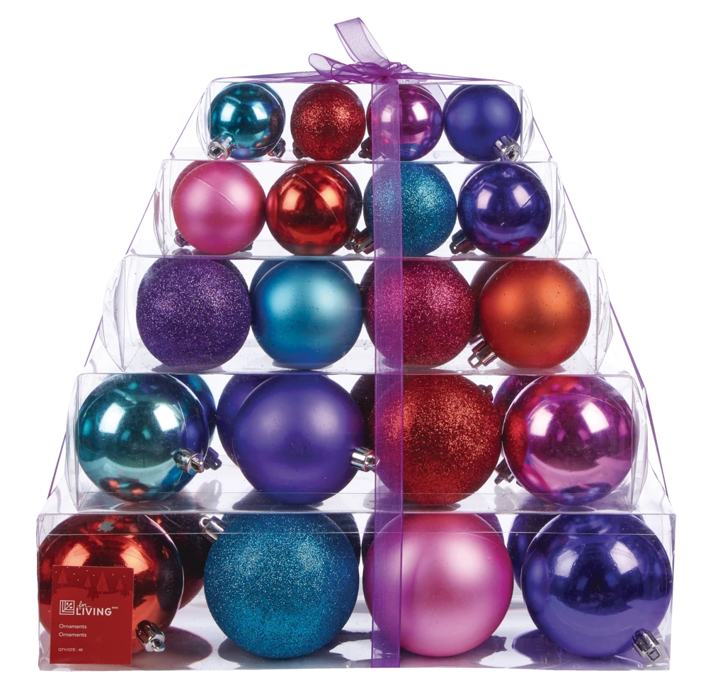 - The For Living Brights Decorative Ornaments Ball Set features 40 brightly coloured ball ornaments for decorating your tree, mantel, or holiday display