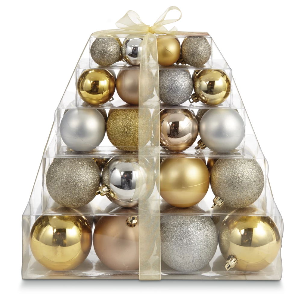 Featuring 40 gold and silver decorative balls, the For Living Gold Decorative Ornaments Ball Set is a must-have for decorating your tree, mantel, staircase, or Christmas display this holiday season. Each Christmas ornament is made of durable, shatterproof plastic for a safe and stylish seasonal accent, especially in homes with children and pets. These decorative balls add festive flair to real or artificial Christmas trees and make an elegant centrepiece in a glass bowl or vase.