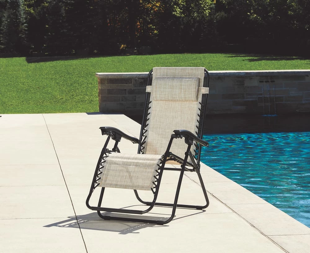 Recline in style with the For Living Sling Zero Gravity Chair/Recliner. This ingenuously designed gravity chair effortlessly reclines and locks into any position. Its heavy-duty steel frame is safe and sturdy and has a powder-coated, rust-resistant finish, with a durable quick-drying sling made of weather-resistant fabric. This recliner gravity chair comes with an adjustable headrest pillow that reduces strain on your neck when reclining. The chair has a maximum weight capacity of 250 lbs (113.4 kg).