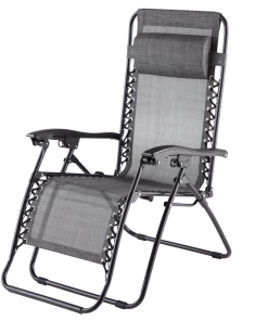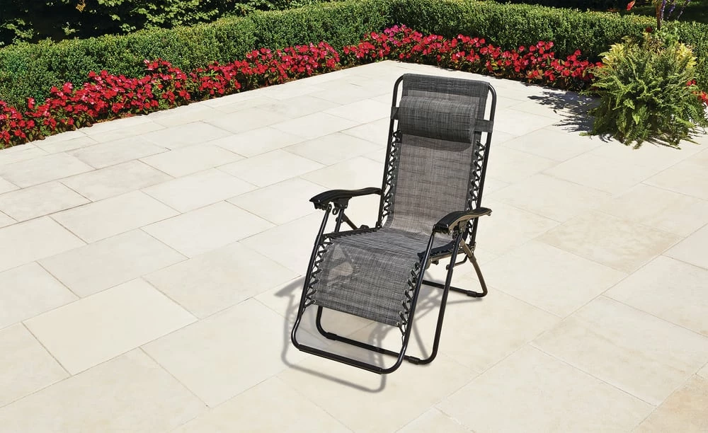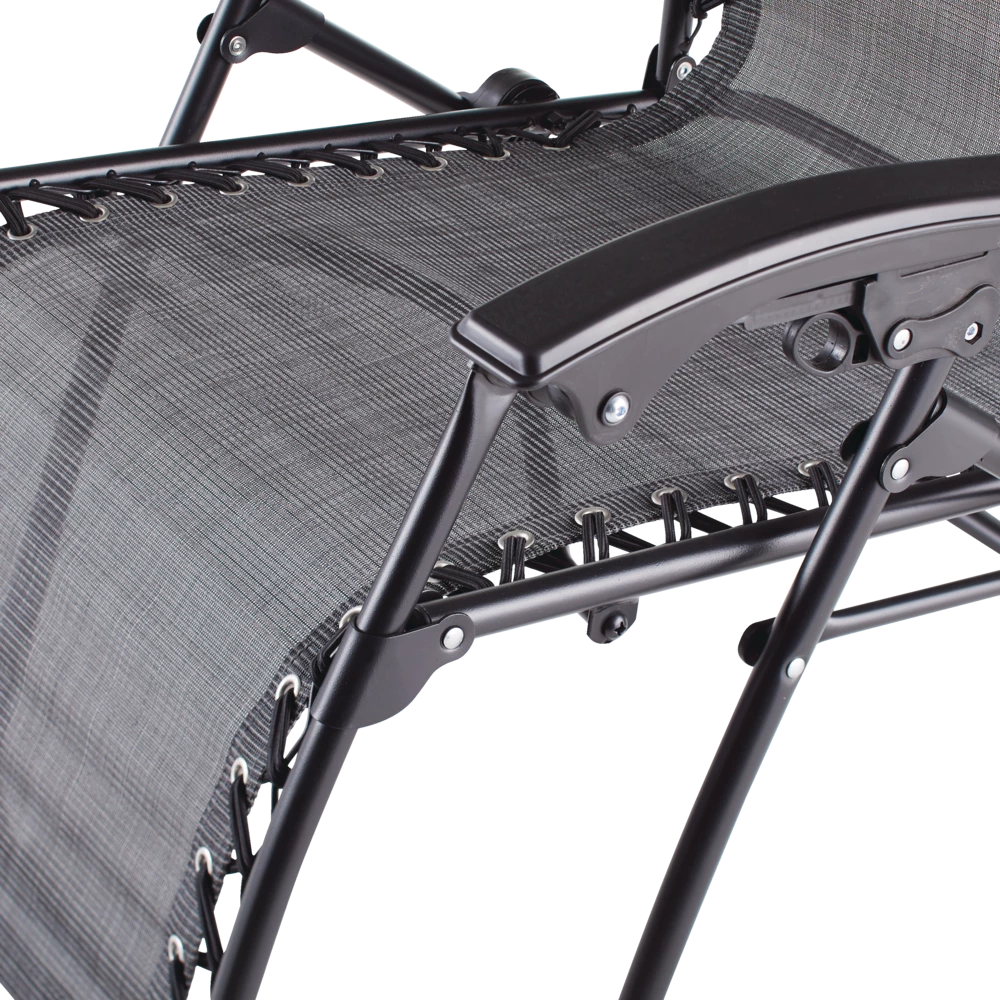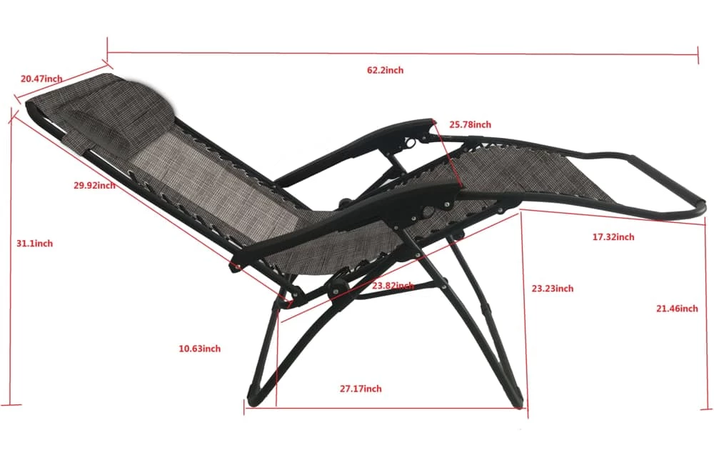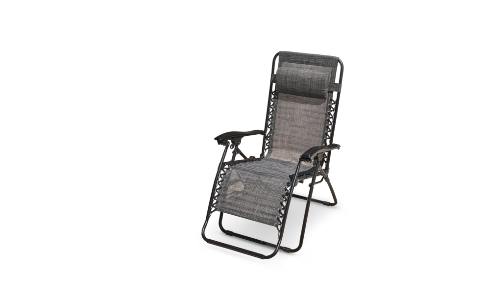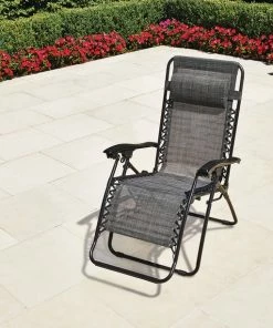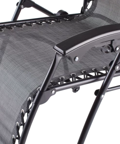 Enjoy the ultimate relaxation with a For Living Sling Zero Gravity Chair/Recliner. This black gravity chair features a heavy-duty, powder-coated steel frame and durable weather-resistant sling which dries quickly. This gravity recliner chair has an adjustable headrest, smoothly locks into any position, and folds to store. The zero gravity chair comes assembled and wipes clean easily. Has a maximum weight capacity of 250 lbs and measures 25-9/16″ W x 61-7/16″ D x 32-1/4″ H reclined.