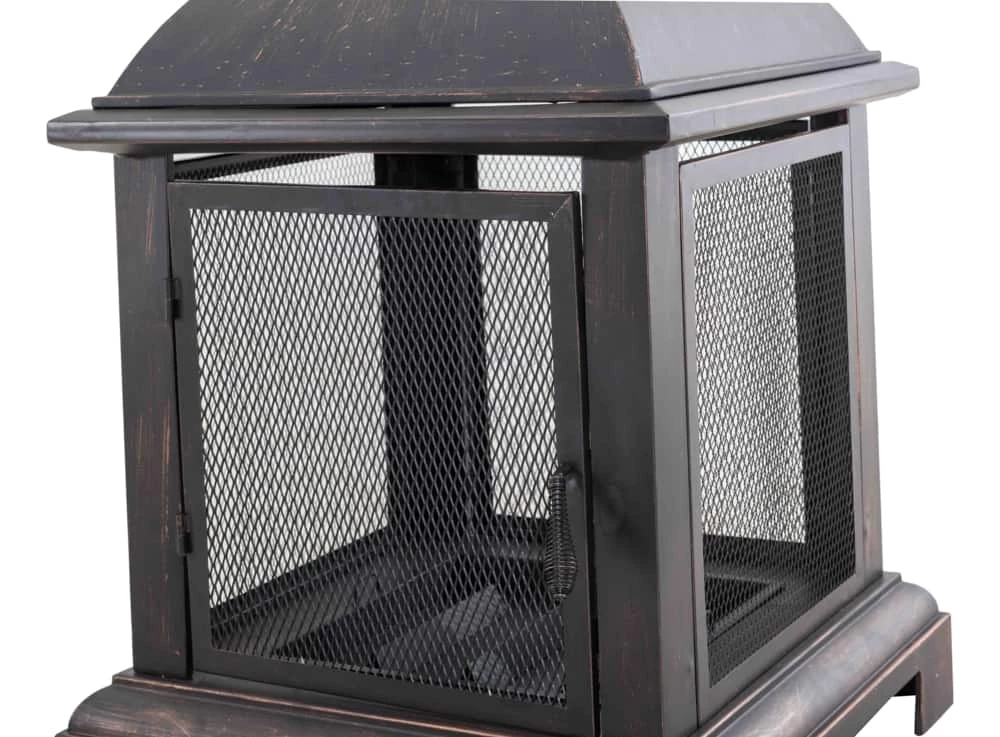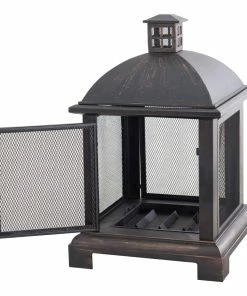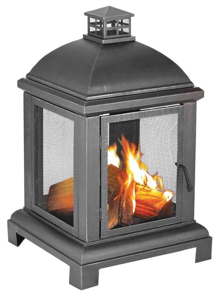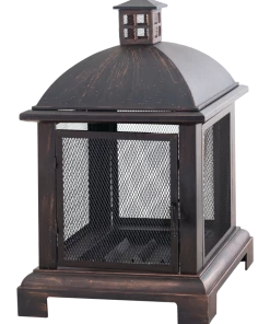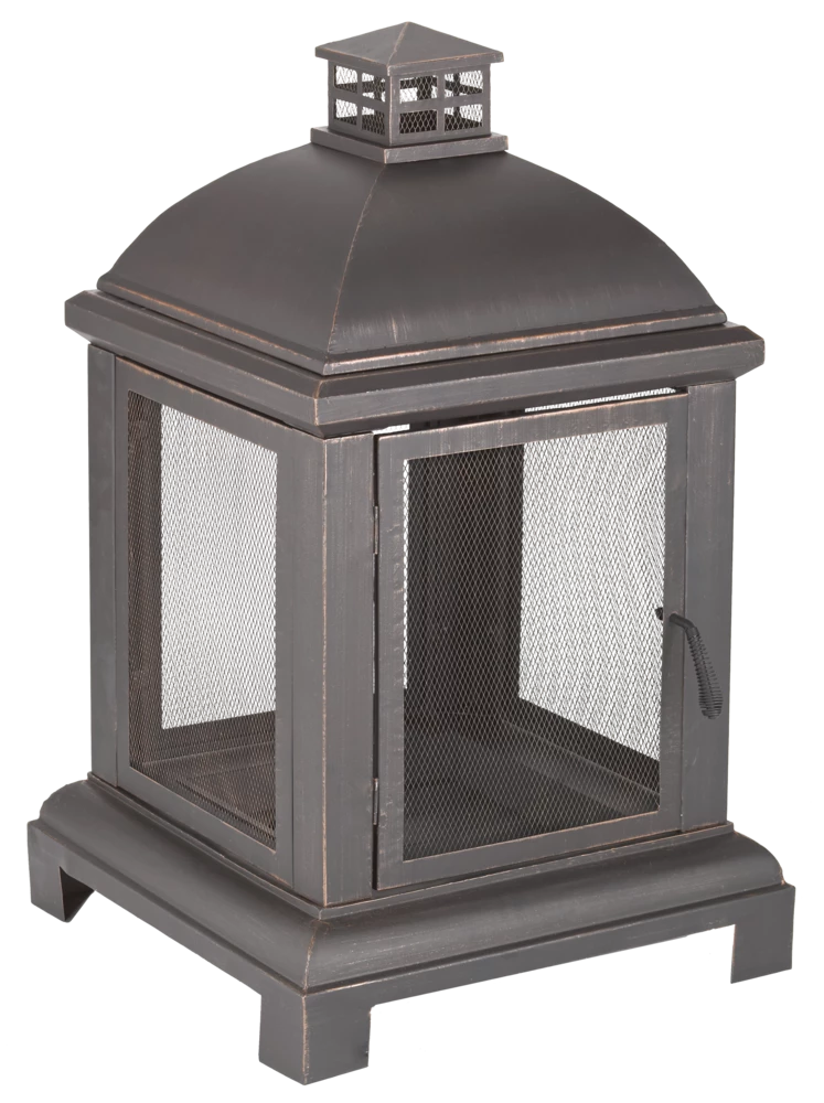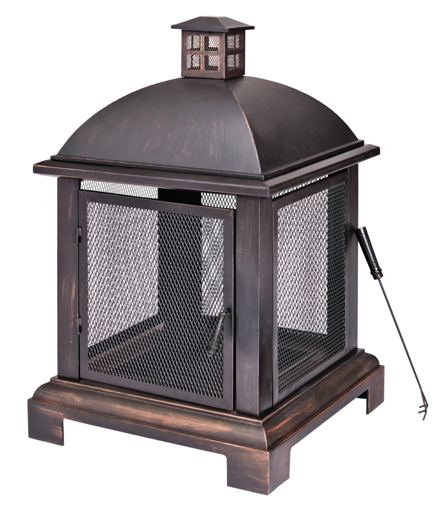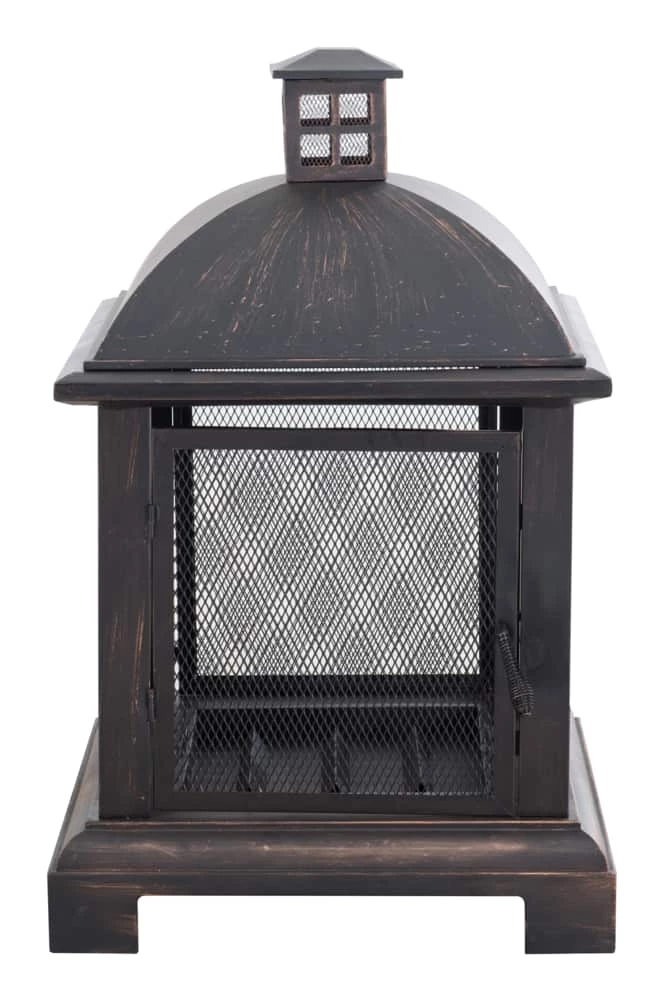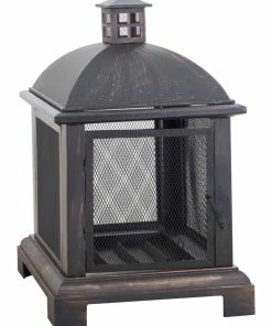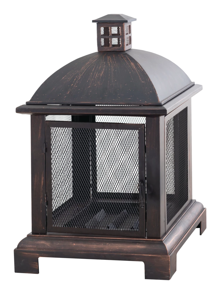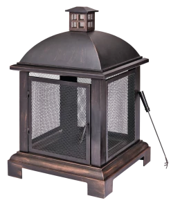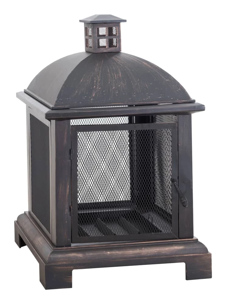 Create memorable outdoor memories around the For Living Marseille wood burning fire pit. Featuring a durable steel construction and stylish antique black finish, this square firepit is designed to provide years of entertainment at your backyard gatherings with family and friends. This outdoor fire pit is easy to assemble and lightweight enough to transport wherever you want to get the fire started. The steel mesh walls give you and your guests an impressive 360° view of the fire inside, making it easy to add ambiance from every angle. The Marseille backyard fire pit features a wood rack to help position firewood and a steel dome top to keep flames and embers safely contained and protected from rain. It also includes a poker for adjusting logs and kindling as needed. When it’s time to make s’mores with the kids or enjoy summer evening drinks with friends, this wood burning fire pit is a fun addition to any patio or yard. The sturdy and attractive steel fire pit can also be used to display candles. With a generous 40″ height and 26″ width and depth, this firepit is an ideal focal point for outdoor entertaining.