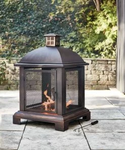 - Features durable steel construction and an antique black finish with 360° view of the fire