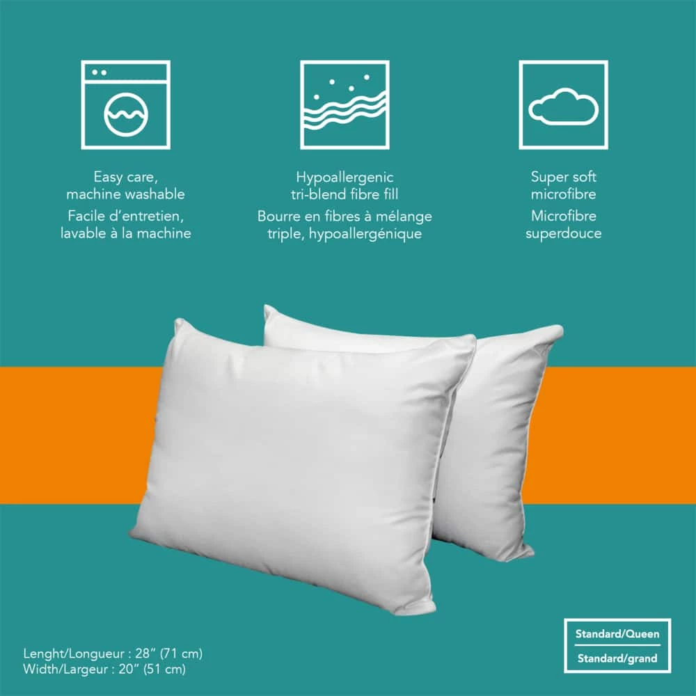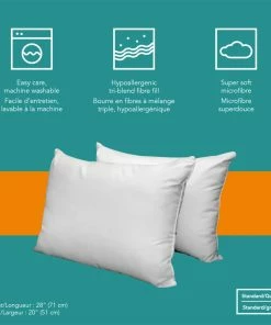 For a good night’s rest, choose these For Living Soft Microfiber Pillows. This pack of two soft hypoallergenic pillows have a Tri-blend™ fibre fill for a great sleep in all positions. The super soft microfibres conform to your body, while the pillows are easy to clean and washing-machine friendly. These pillows are standard/queen size, and measure 28″ x 20″ (71 x 51 cm), making them a comfortable size for any bed.