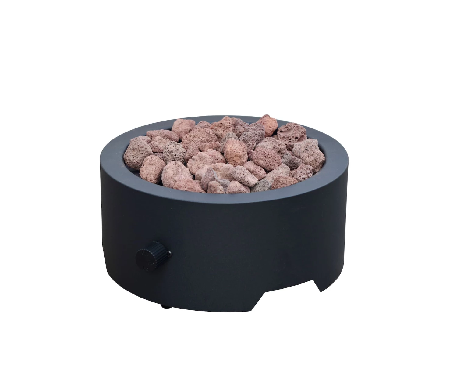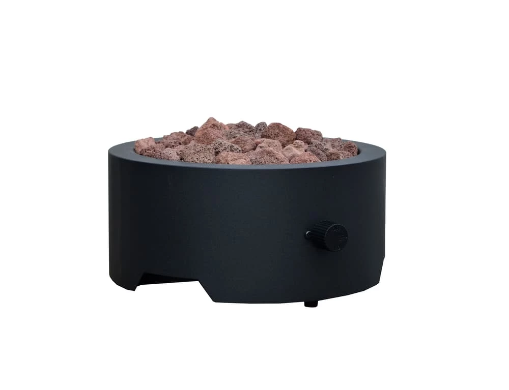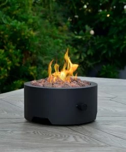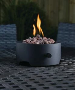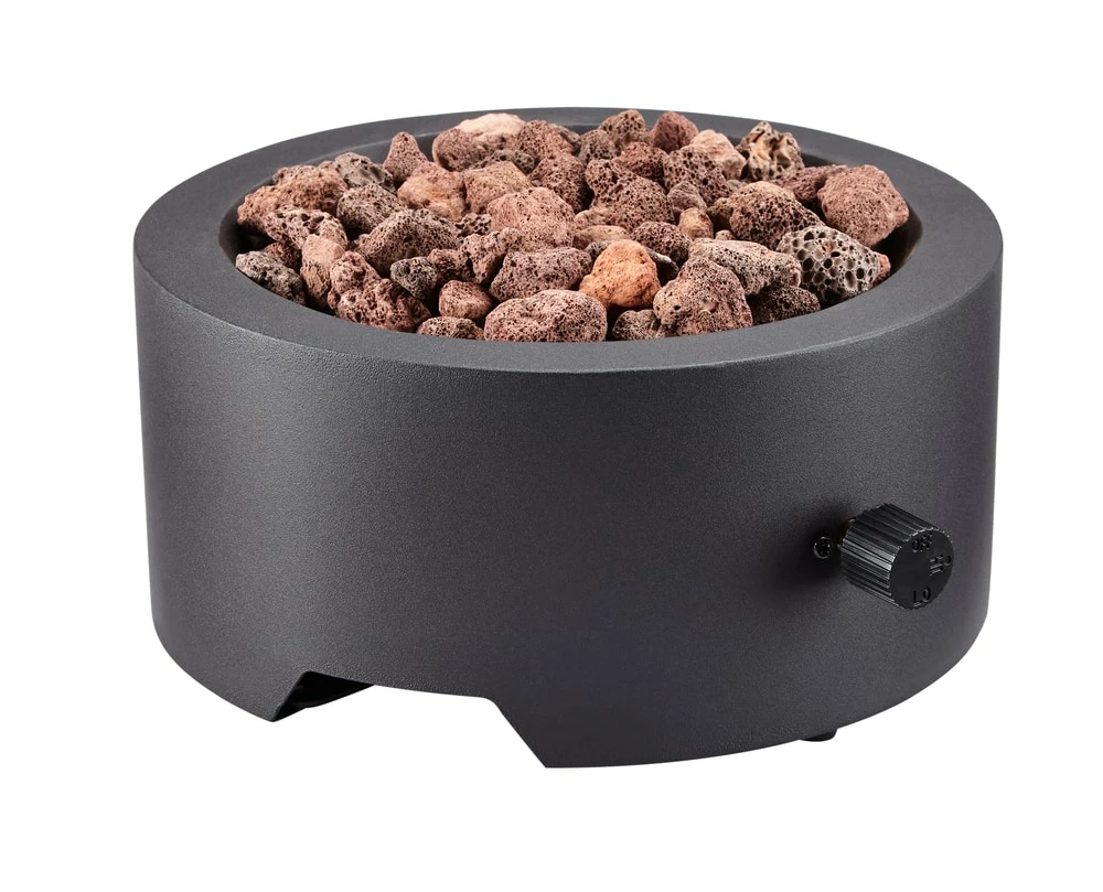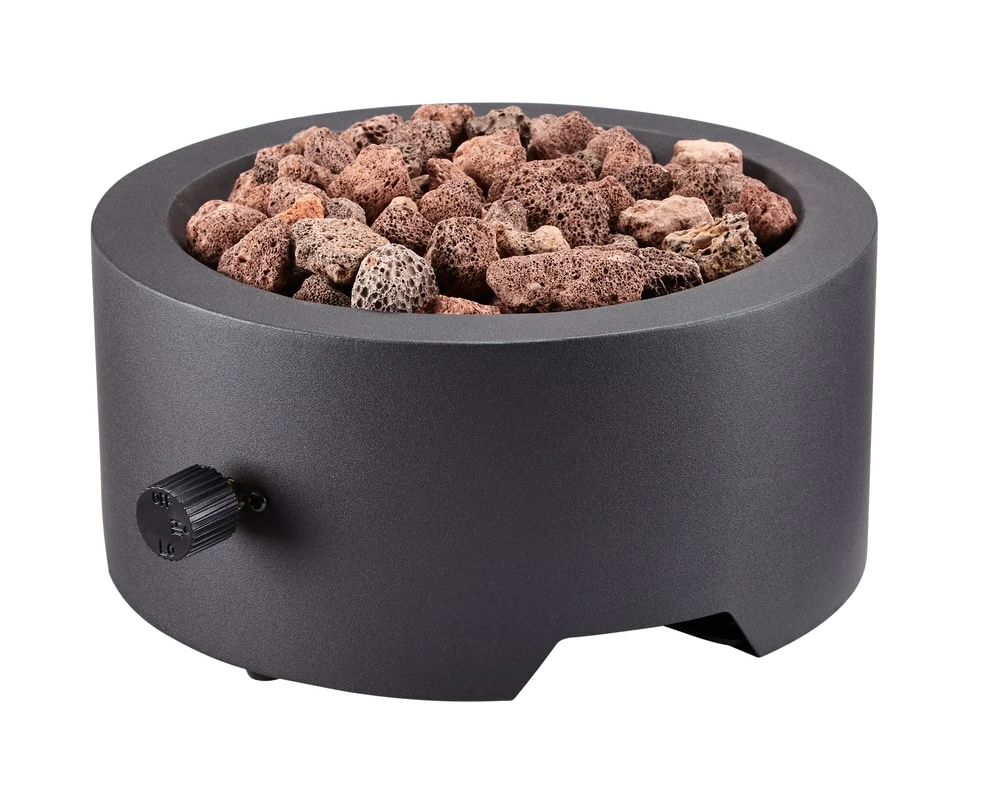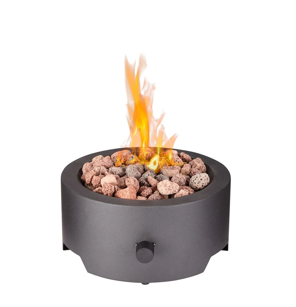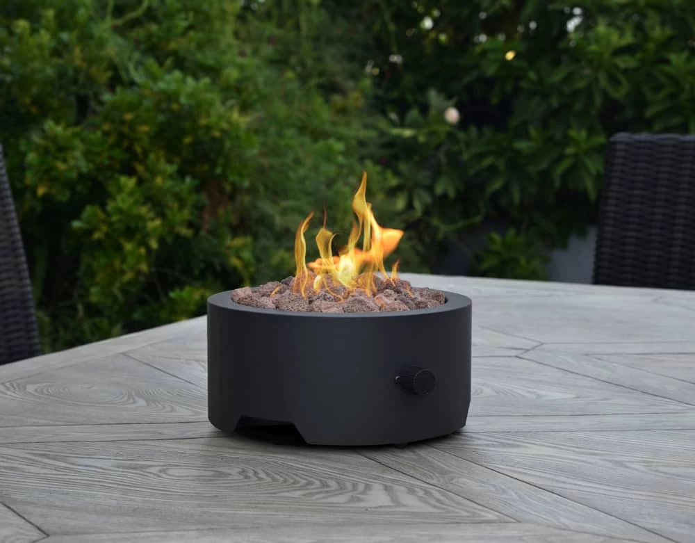 In just a few minutes, you can transform your patio table into an inviting dining environment with the For Living Tabletop Propane Gas Fire Bowl. This propane fire table easily connects through the umbrella hole in your outdoor table to a 1 lb. propane tank below in a specially constructed bracket, so you can turn any patio table into an evening hotspot. Made from powder-coated steel with a stainless steel burner, this sleek propane fire bowl will complement your table design and blend with your outside décor, turning your space into a summer oasis perfect for family gatherings, outdoor dinner parties, or a romantic evening under the stars. The lava rocks offer a warm, natural aesthetic for added ambiance, while the auto safety shut-off ensures the fire table never stays on for too long. This fire pit isn’t just for looks – it delivers up to 10,000 BTUs of heat to help you escape the breeze and get cozy by the glow of the fire on chilly evenings. This fire bowl features a match light ignition with a control knob that can be used to adjust the flames. Propane tank not included.