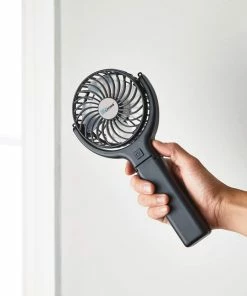 Stay cool with this For Living USB & Battery Operated Compact Personal Fan. This portable desk fan can be powered by four AA batteries or a USB charger. A built-in handle lets you pick up this portable fan and take it with you wherever you go, or fold it in for simple desktop use. An easy push-button control turns the black desk fan on or off, and an adjustable fan angle lets you control the airflow.